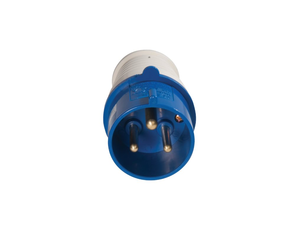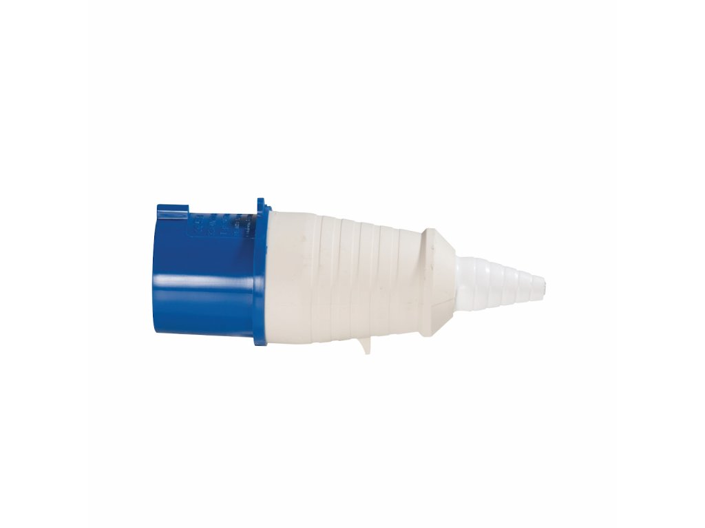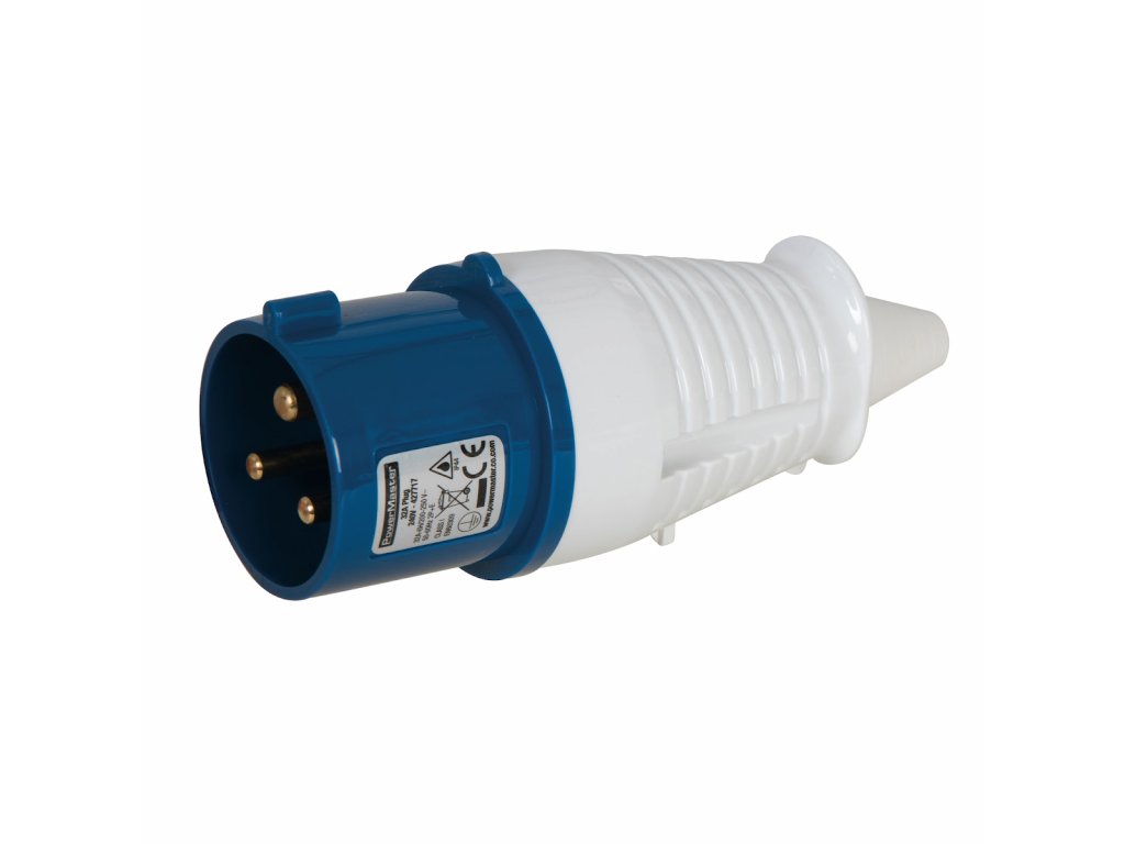 Langlebiger und schlagfester Stecker mit versenkten Klemmen und Schrauben zur Befestigung von Kabeln. Geeignet für den Bau- und Industrieeinsatz. Spritzwassergeschützt (IP44).
