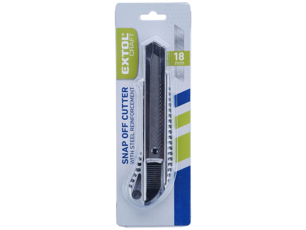 Abbrechbarer Metallmesser mit Metallverstärkung für Abbrechklingen 18 mm. Einfacher und schneller Klingenwechsel, verstellbarer Reiter mit Anschlägen zum Klingenausschieben.