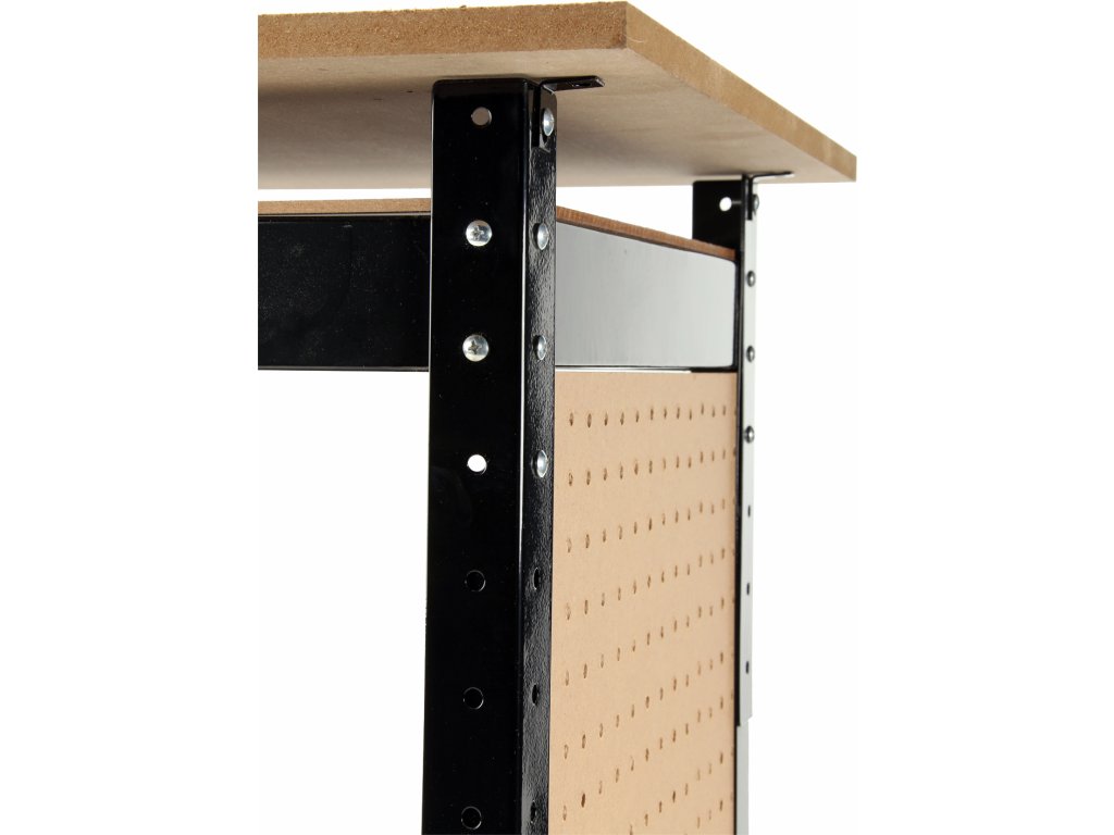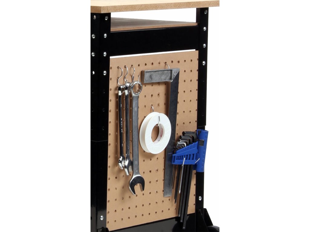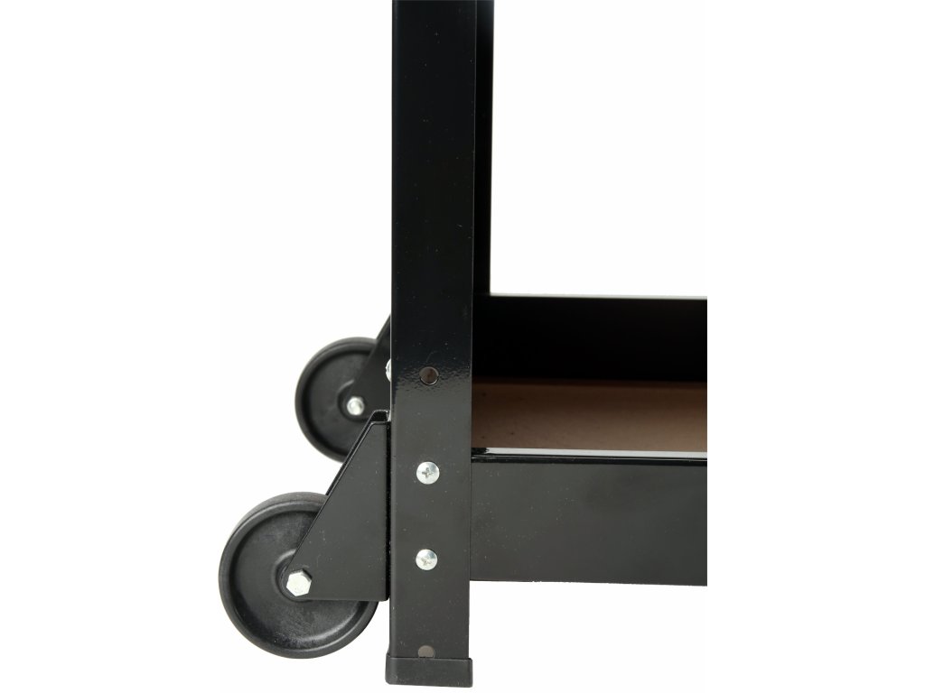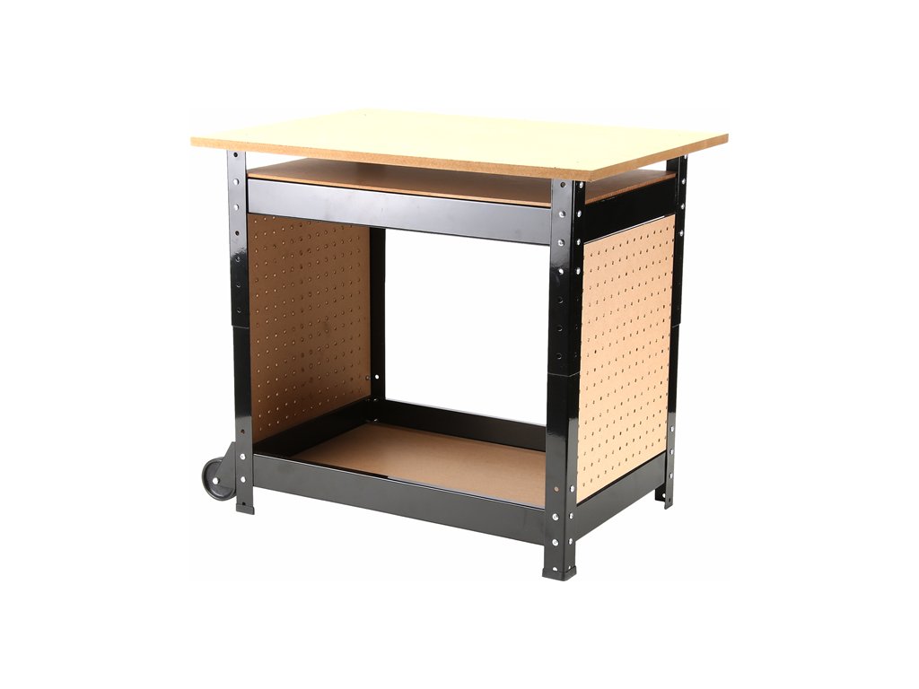 Leichter Tisch zum Werkzeuglagern und -einhängen, für Mess- und Prüftechnik und kleinen elektrischen Geräten, mit 2 Rädern für einfachere Manipulation. Obere Platte aus MDF 15 mm, untere Platte und Seitenwände 5 mm, Konsturktion aus lackierten Stahlprofilen, Stärke 1 mm. Gesamtmaße 690 × 510 × 790 mm.