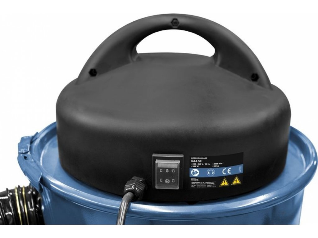 Aufbau: Auffangbehälter aus Metall, 2 m flexibler Saugschlauch (→ Durchmesser: 100 mm; inkl. Reduktion für alle gängigen Tischsägen-/Werkzeugmaschinen-Sauganschlüsse: 34/40/45/67/100 mm).
