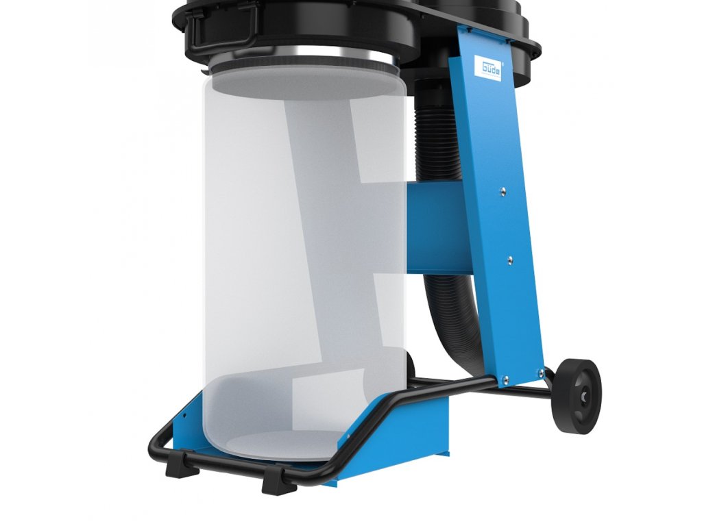 Aufbau: stabiler Stahlrahmen, flexibler Saugschlauch (Länge: 2 m, Durchmesser: 100 mm), Filtersack, Fangsack, Fahrgestell mit Laufrädern (2).