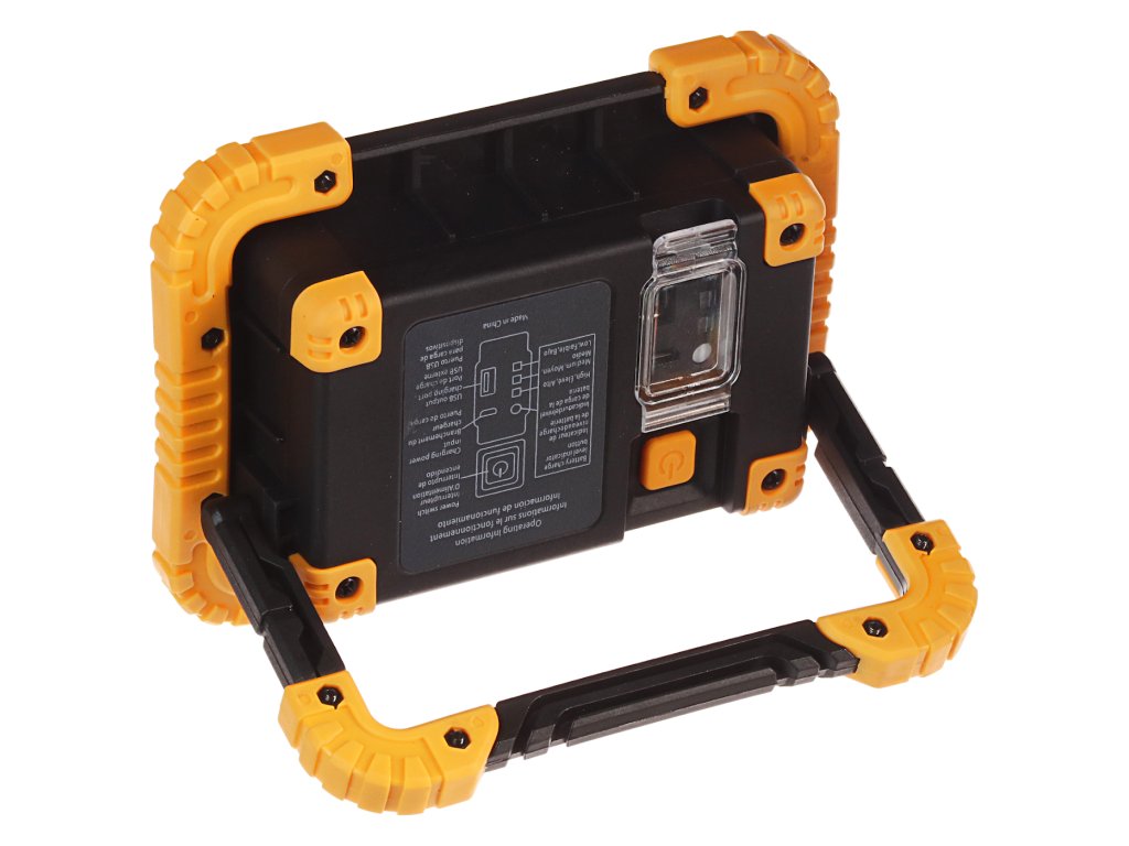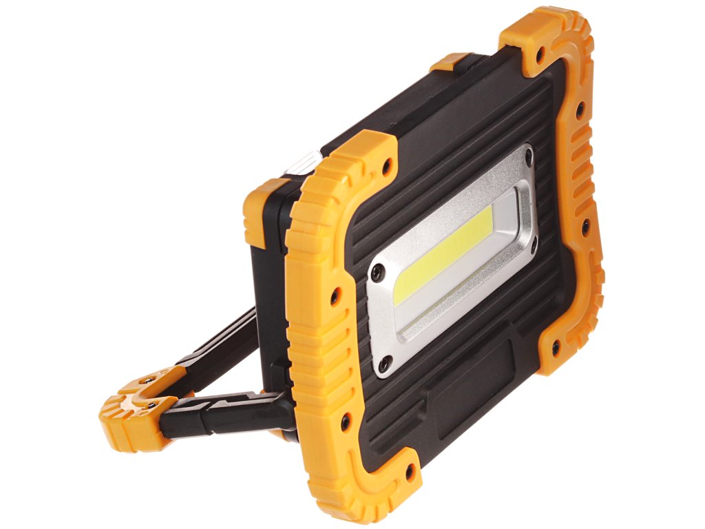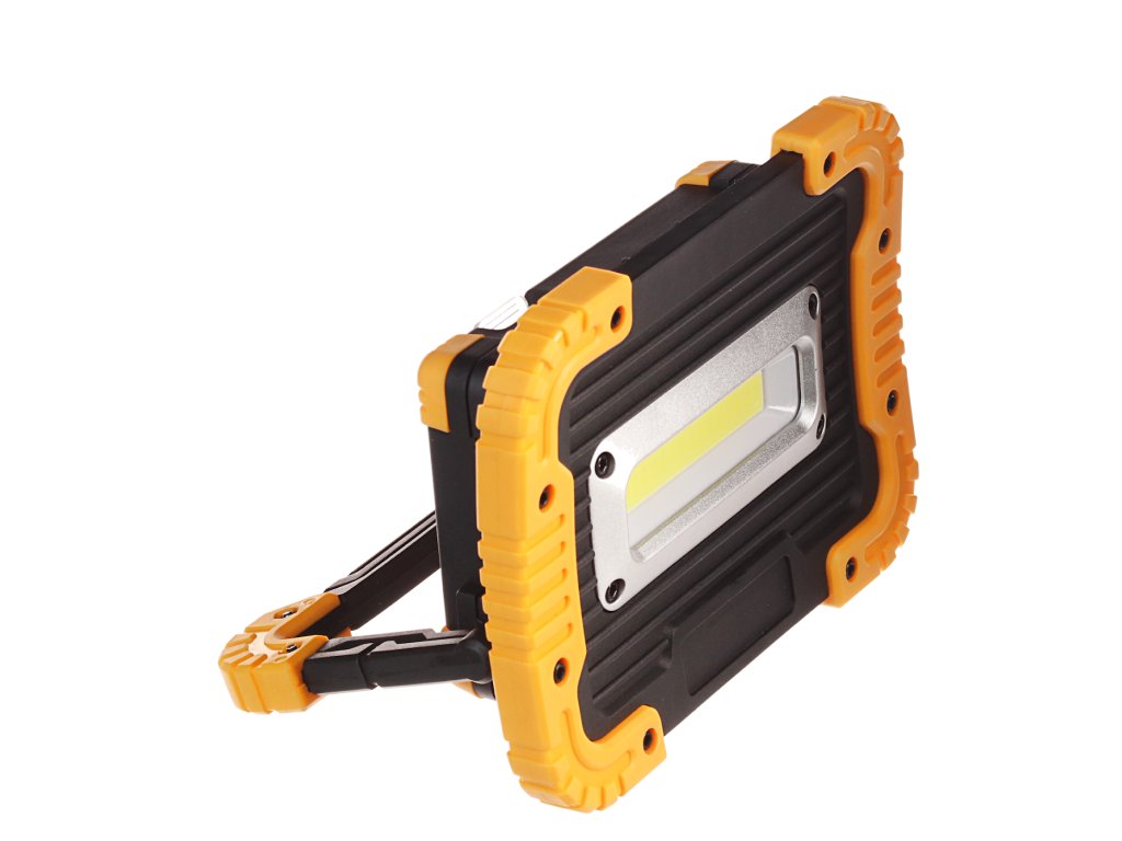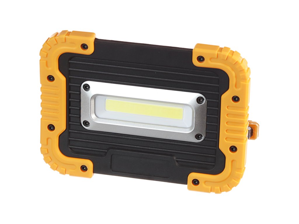 Modernes, dünnes Design mit Beschädigungsschutzelementen und Stütze, superhelle COB-LED, Farbwiedergabeindex (CRI) 80. Die Leuchte wird durch zwei eingebaute, wiederaufladbare Lithium-Ionen-Batterien versorgt, Strahlwasser.
