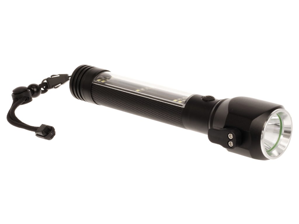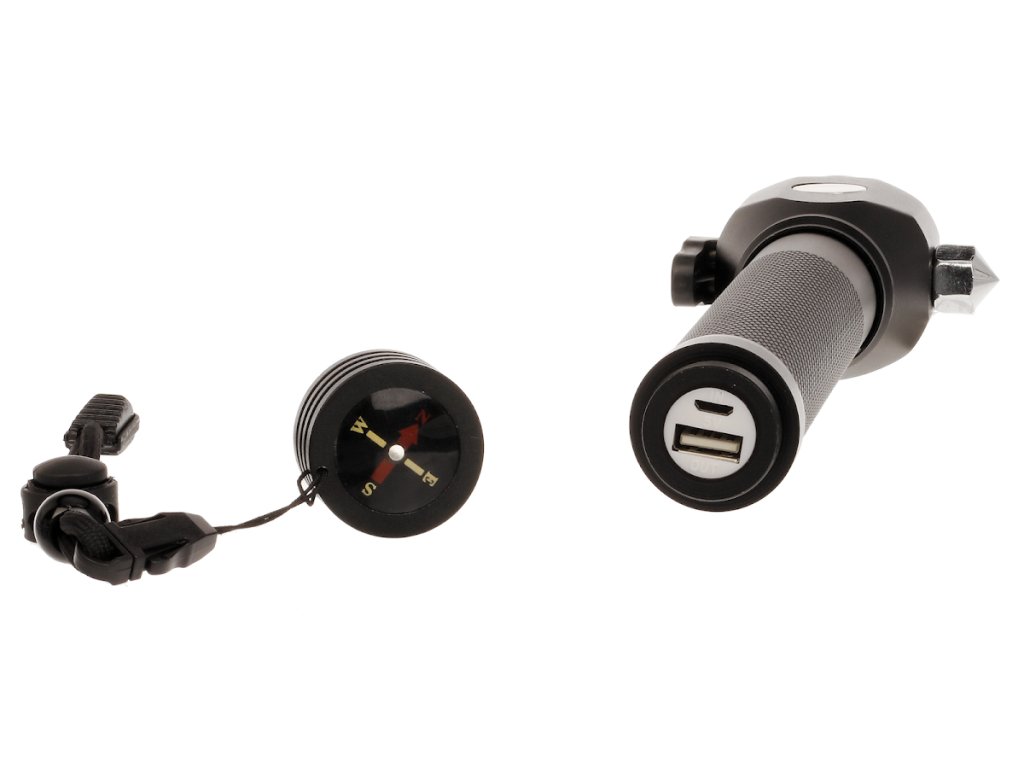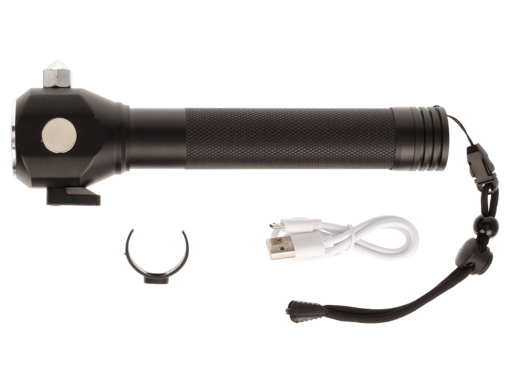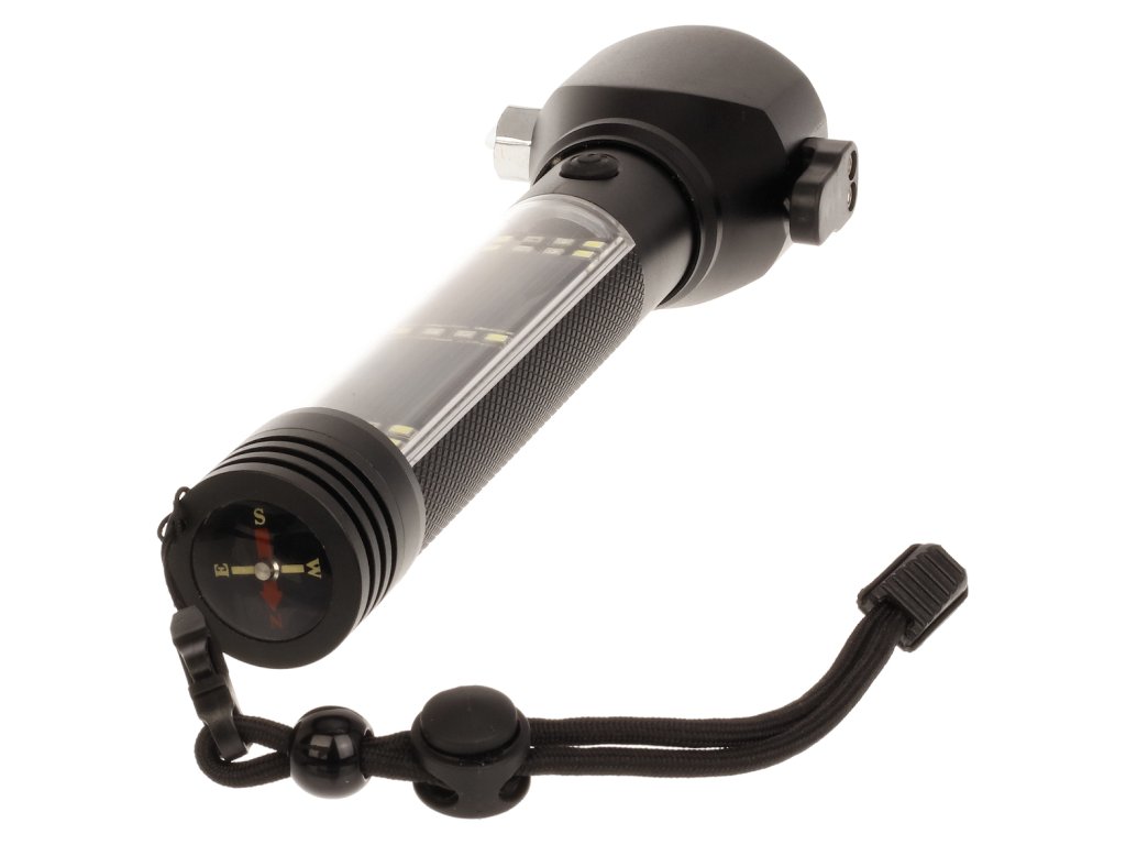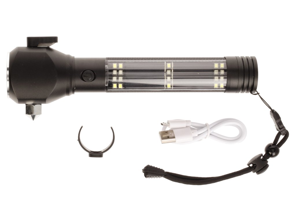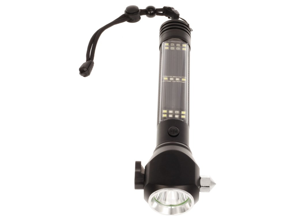 Taschenlampe in Aluminium/ABS-Ausführung mit vielen Funktionen. LED-Frontreflektor: CREE XPE 3 W, 200 lm mit 3 Modi, Reichweite 200 m, Lebensdauer 100.000 h, Leuchtdauer 4 - 6 Std. LED-Seitenleuchte SMD 1.000 lm mit 4 Modi, Leuchtdauer 4 - 7 h Wiederaufladbarer Li-Ionen-Akku 18650 3,7 V/2.000 mAh, Aufladen über das integrierte Solarpanel oder USB (USB-Netzteil und Kabel nicht im Lieferumfang enthalten). Die Taschenlampe kann zum Notaufladen eines Mobiltelefons verwendet werden, sie ist mit einem starken Magneten, einem Notfallhammer zum Einschlagen der Scheibe, einem Messer zum Durchtrennen des Gurtes im Auto und einem Kompass an der Unterseite ausgestattet.