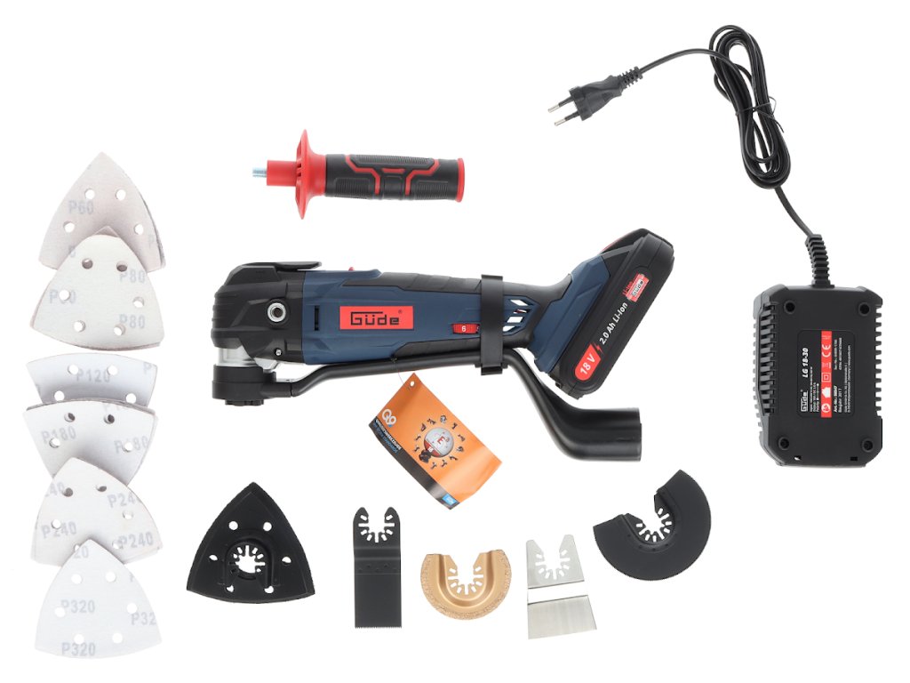 Ausstattung: Li-Ion-Akku 18 V/2,0 Ah; Ladegerät 3,0 A/h; 3 Sägeblätter (Tauch-, Segment-, Diamant); Delta-Schleifplatte 93 mm; Schleifpapierset K60 - K320, 18 Stück; Schaber; Transportkoffer aus Kunststoff.