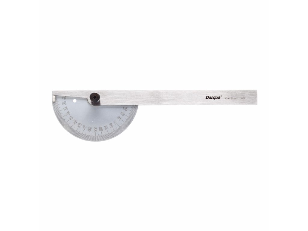 Winkelmesser aus Edelstahl mit Kontermutter. Skalenbereich 0 - 180°, 1° Teilungen. Armlänge 150 mm, Basisbreite 85 mm.