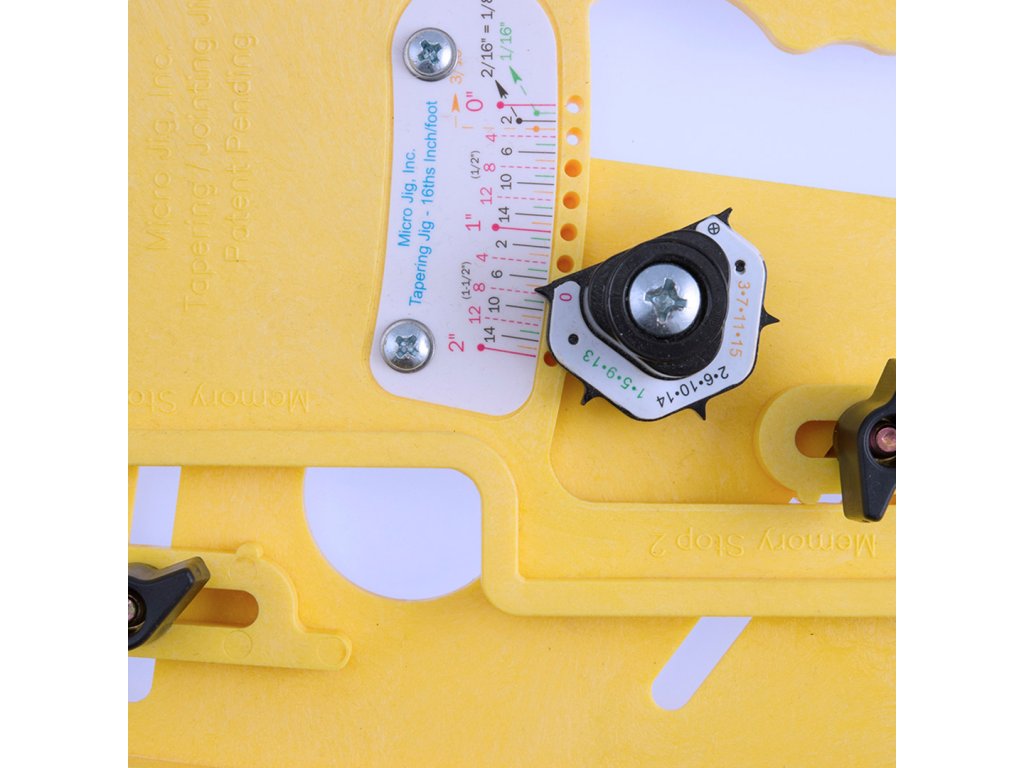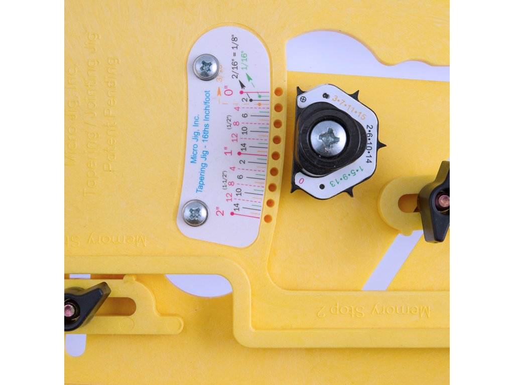 Verwenden Sie die Schieberegler, um die Verjüngung von 0 bis 2 Zoll in Schritten von 1/16 Zoll einzustellen. Auf dem Microdial finden Sie eine einfache Verjüngungsformel, damit Sie die Werte nicht erraten müssen. Verwenden Sie das zweite Einstellrad, um präzise Winkel von 1/8 Grad einzustellen und mit einer einfachen Drehung von 0 auf 10 Grad zu erweitern. Die Messmarkierungen sind farblich gekennzeichnet und können gleichzeitig arretiert werden, sodass Sie schnell und genau den gewünschten Winkel erhalten.