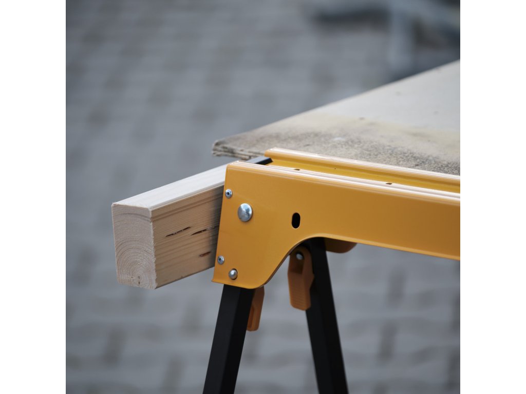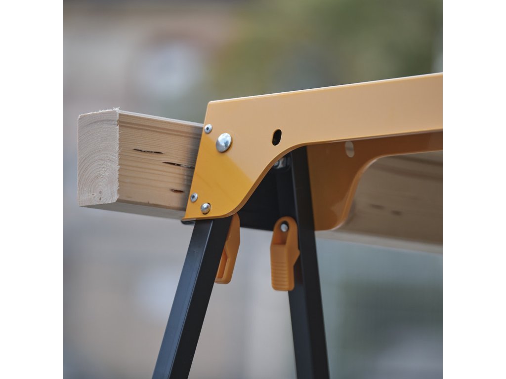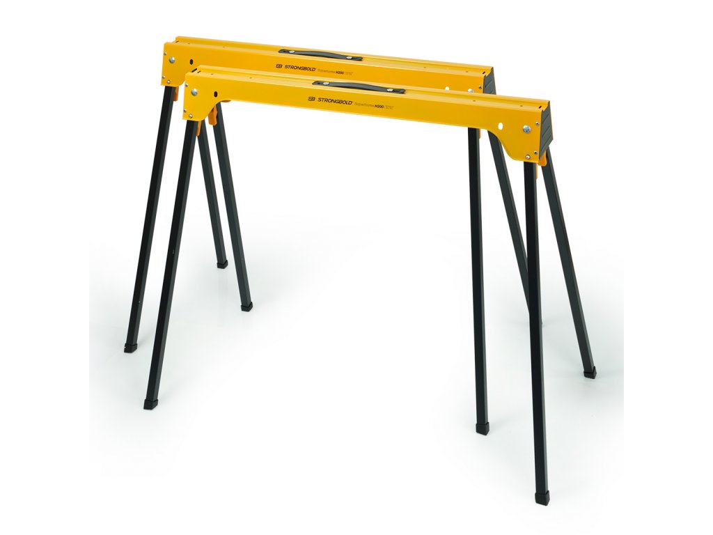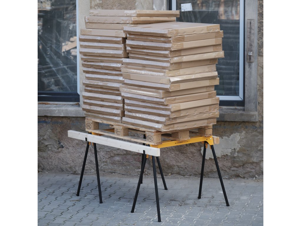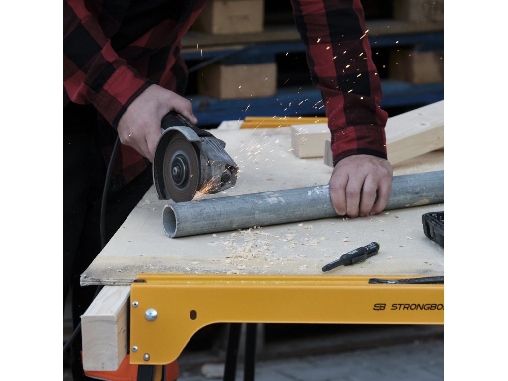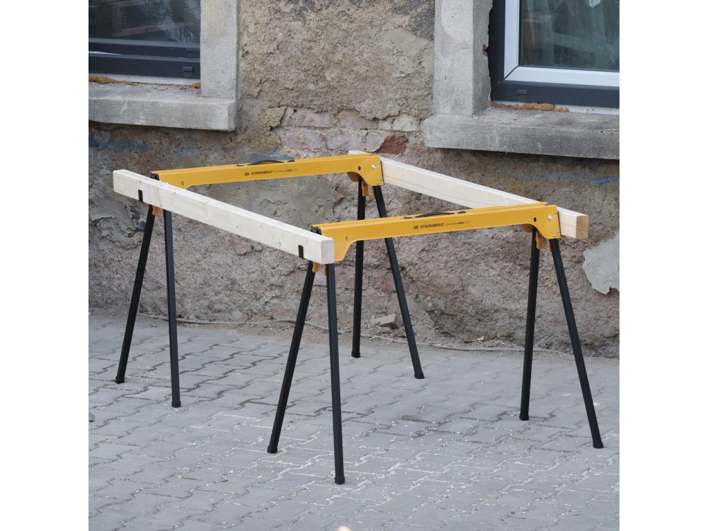 Arbeitsziege der Marke STRONGBOLD mit einer Arbeitshöhe von 75 cm. Rutschfeste Fußenden. Stahlkonstruktion mit langlebiger Pulverbeschichtung. Belastbarkeit paarweise bis 900 kg. Eingelassener Griff für einfachen Transport. Abnehmbare Arme für bis zu 45 mm breite Balken (2x4), um eine Arbeitsfläche oder einen Tisch zu schaffen. Kann auch als Stütze beim Schneiden verwendet werden. Dank des praktischen Faltmechanismus lässt sich die Ziege im Handumdrehen überall zusammenfalten.