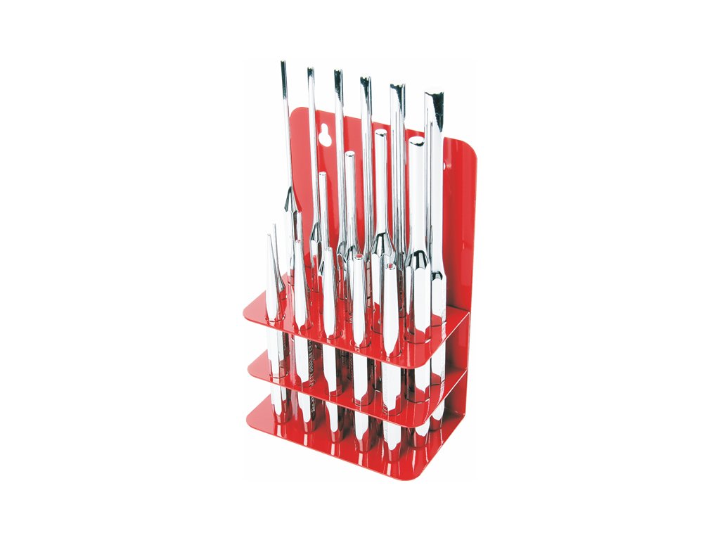 Der Austreibersatz im praktischen Ständer aus Stahlblech beinhaltet 5 Stück konischer Lochdorne 2 – 6 mm, 6 Stück Austreiber 2 – 8 mm, 6 Stück verlängerter Austreiber 3 – 10. Material Cr-Mo-Stahl, polierte Oberfläche aus Chrom.