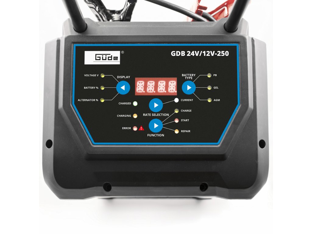 Automatische Ladung (10-stufiger Ladezyklus) oder Erhaltungsladung (Puls) von 12 - 24 V Blei-Säure-Batterien mit Elektrolytlösung (WET), Gelelektrolyt (GEL), AGM (glaslaminierte Mikrofaser) und verschlossenen wartungsfreien Batterien (MF).