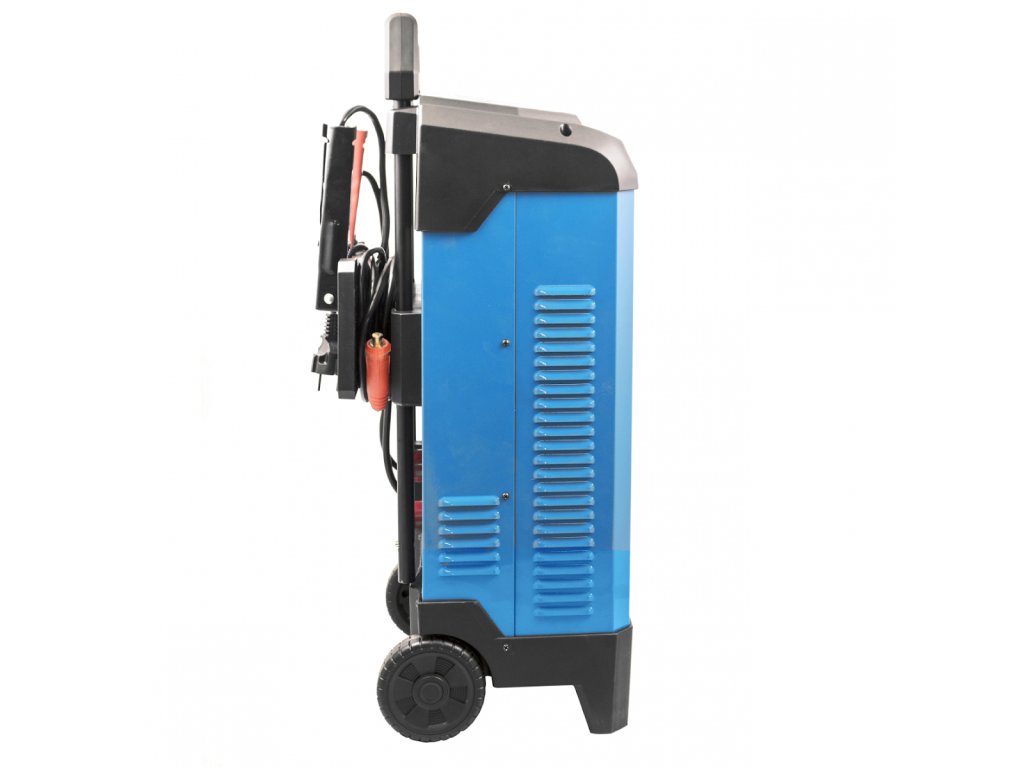 Aufbau: Fahrgestell aus Stahlblech, Mikroprozessorsteuerung, Bedienpult inkl. LED-Displays, 1,8 m Ladekabel mit Anschlussklemmen, Teleskopgriff, Rollen.