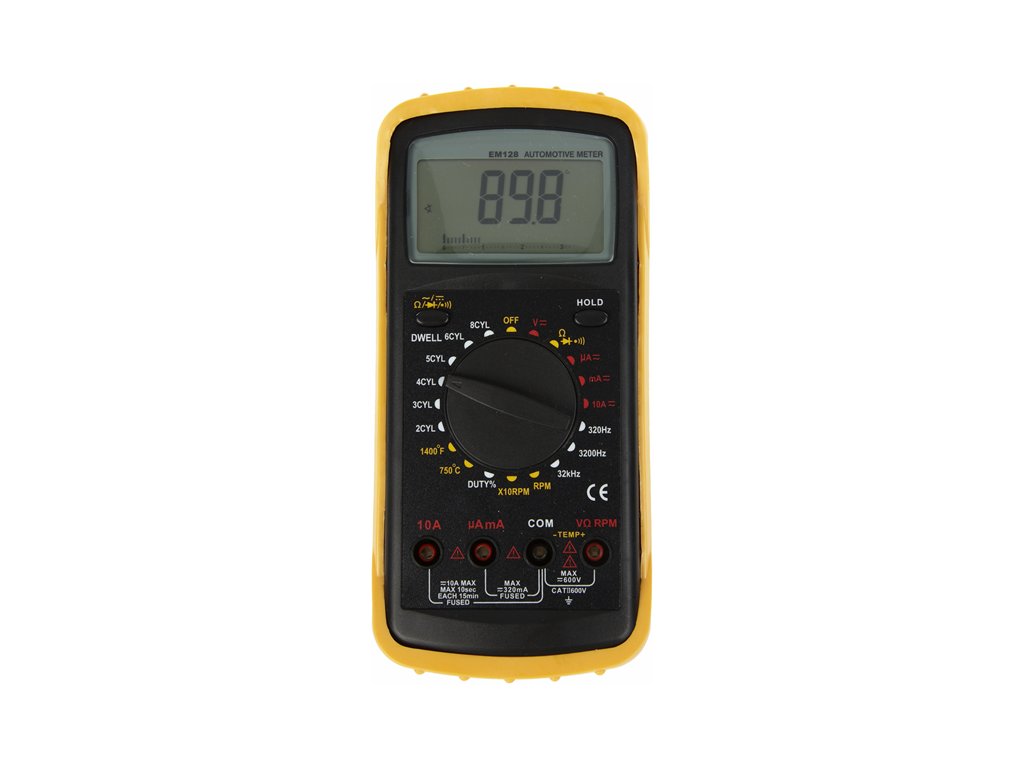 Schnelle Richtdarstellung des Ergebnisses auf der Skala. Übersichtliche LCD-Anzeige. Automatische/manuelle Bereichauswahl. Hold-Funktion. Motorwahl nach der Zylinderanzahl (2, 3, 4, 5, 6, 8). Einspeisung 9 V Batterie, Gleichstromspannung 326 mV; 3,26 V; 32,6 V; 326 V; 1 000 V, Wechselstromspannung 3,26 V; 32,6 V; 326 V; 750 V, Gleichstrom 326 νA; 3 260 A; 32,6 mA; 326 mA; 10 A, Wechselstrom 326 νA; 3 260 A; 32,6 mA; 326 mA; 10 A, Widerstand 326 α; 3,26 kα; 32,6 kα; 326 kα; 3,26 Mα; 32,6 Mα, Frequenz 320 Hz; 3 200 Hz; 32 kHz, Arbeitszyklus 0,1 – 99,9 % > 100 νs < 100 ms, Temperaturmessung -20 – 750 °C/ - 4 – 1 382 °F, Drehzahl 0 – 32 600 U/min, Diodentest: ja 3 V/1 mA. Abmessungen 93 × 200 × 50 mm. Lieferumfang: Tester, Batterie, Temperaturfühler.