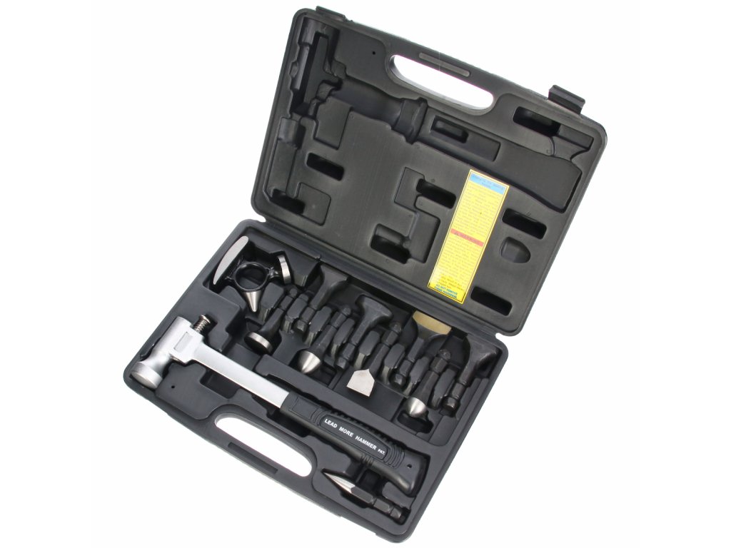 Hammer mit Formgriff und 10 wechselbare verschiedenförmige Schlagbolzen aus hochwertigem Karbonstahl. Für Autokarosseriereparaturen geeignet, übersichtlich im Kunststoffkoffer aufbewahrt.