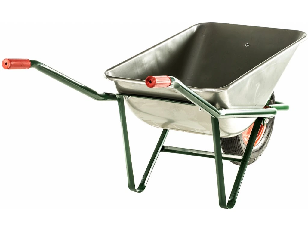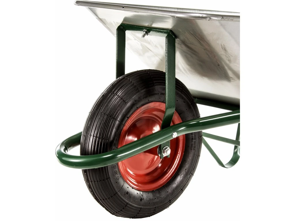 Zum Transport vom Schüttgut, im Bauwesen, Garten, in Hütten. Aus verzinktem Stahl, lackierter Rahmen, Griffschutz, Gummi-Luftrad 400 × 100 mm. Mulde 60 l, Gesamtmaße 1 500 × 560 × 605 mm, Mulde 820 × 515 × 280 mm, Tragfähigkeit 100 kg.