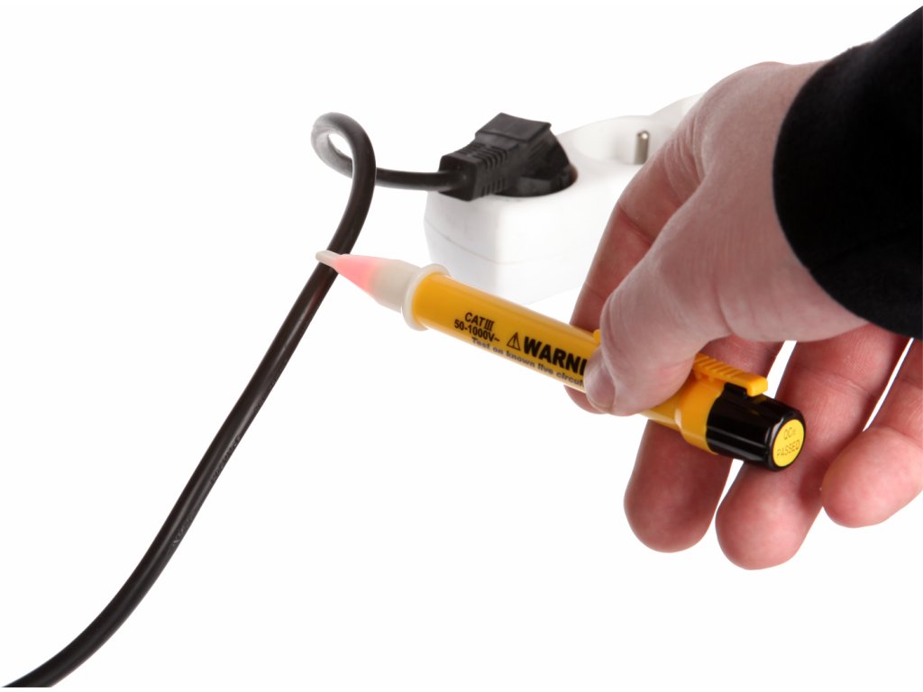 Taschengerät zum Ermitteln der Anwesenheit von Wechselstromspannung bei Ausgängen, Kabeln, Lichtanlagen, Verbrauchern, Schaltern oder zum Suchen von Drahtunterbrechungen. Beim Erkennen der Wechselstromspannung leuchtet die LED-Diode auf. Das Gerät kann Spannungen von 50 V bis 1 000 V erkennen. Spannungsversorgung 2 × 1,5 V AAA-Batterie.