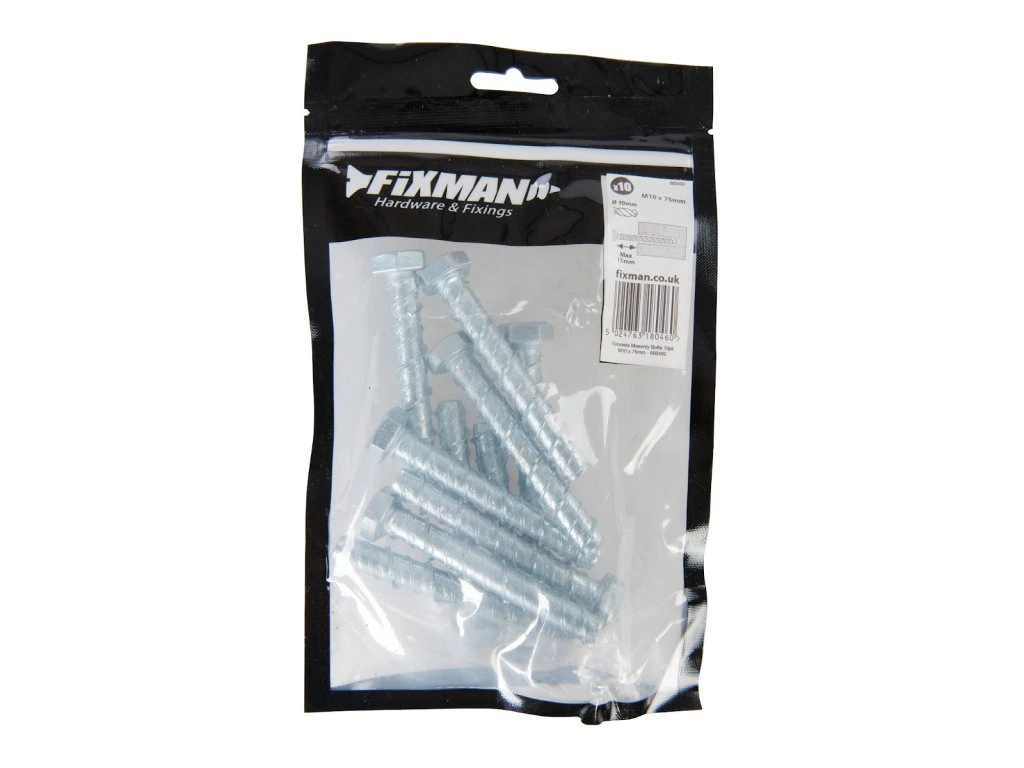 Gehärtete, selbstschneidende Schraube für Beton zur Befestigung von Handläufen, Geländern, Leitern, Kabeltrassen etc. Komplett abnehmbarer Anker, besonders geeignet für temporäre Anbauten (z.B. Schalungsstützen). Einkerbungen an den Gewinden erleichtern das Einschrauben. Die Möglichkeit, Schrauben wiederzuverwenden, senkt die Kosten. In einer Packung mit 10 Stk.