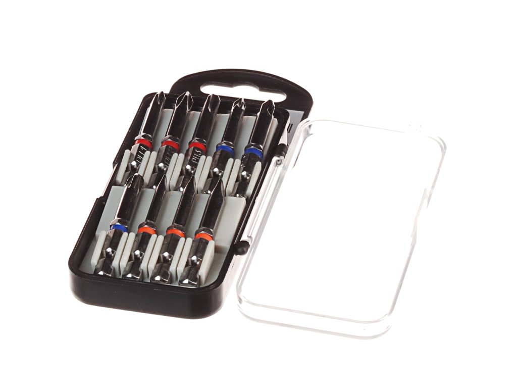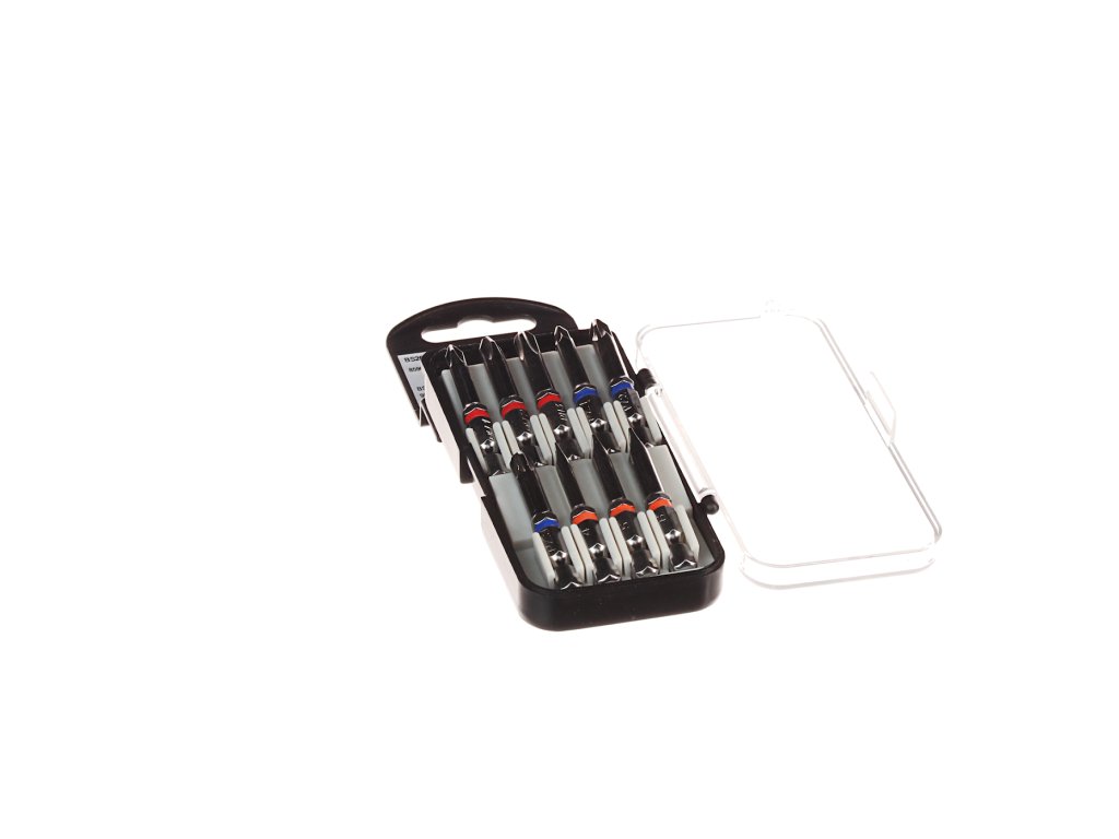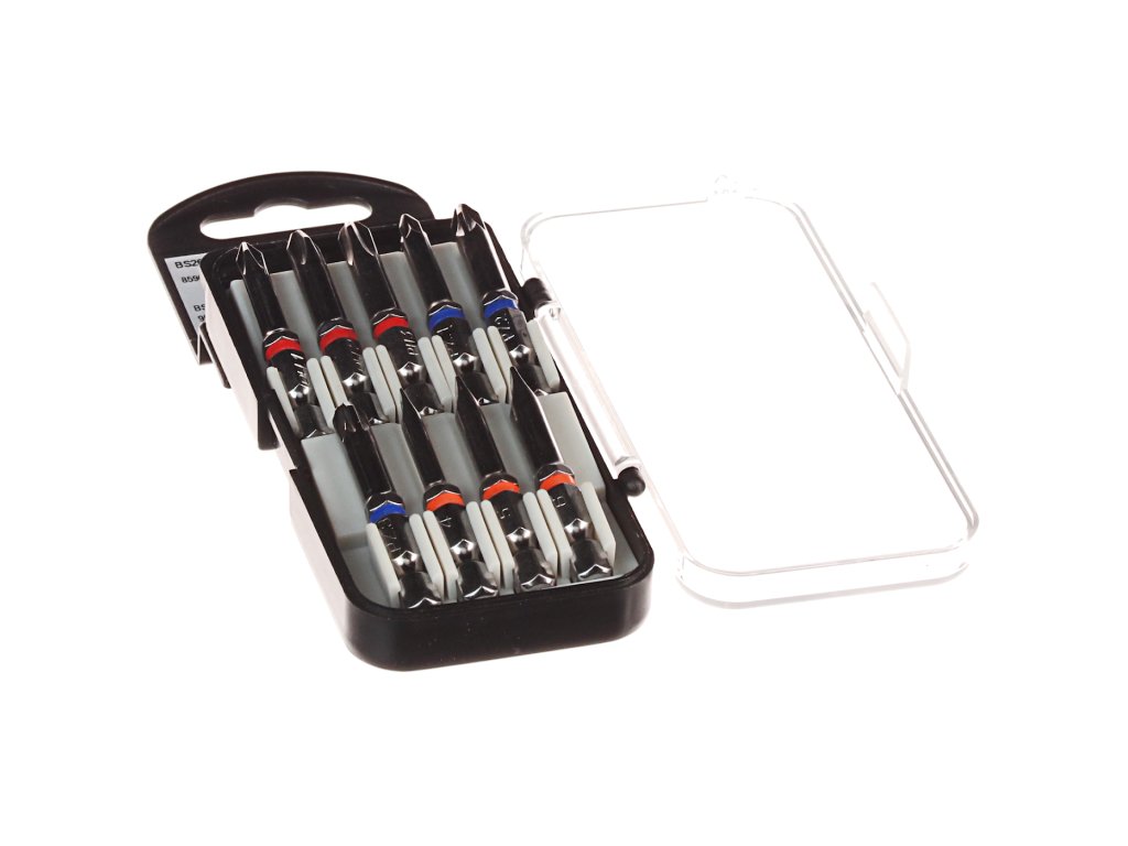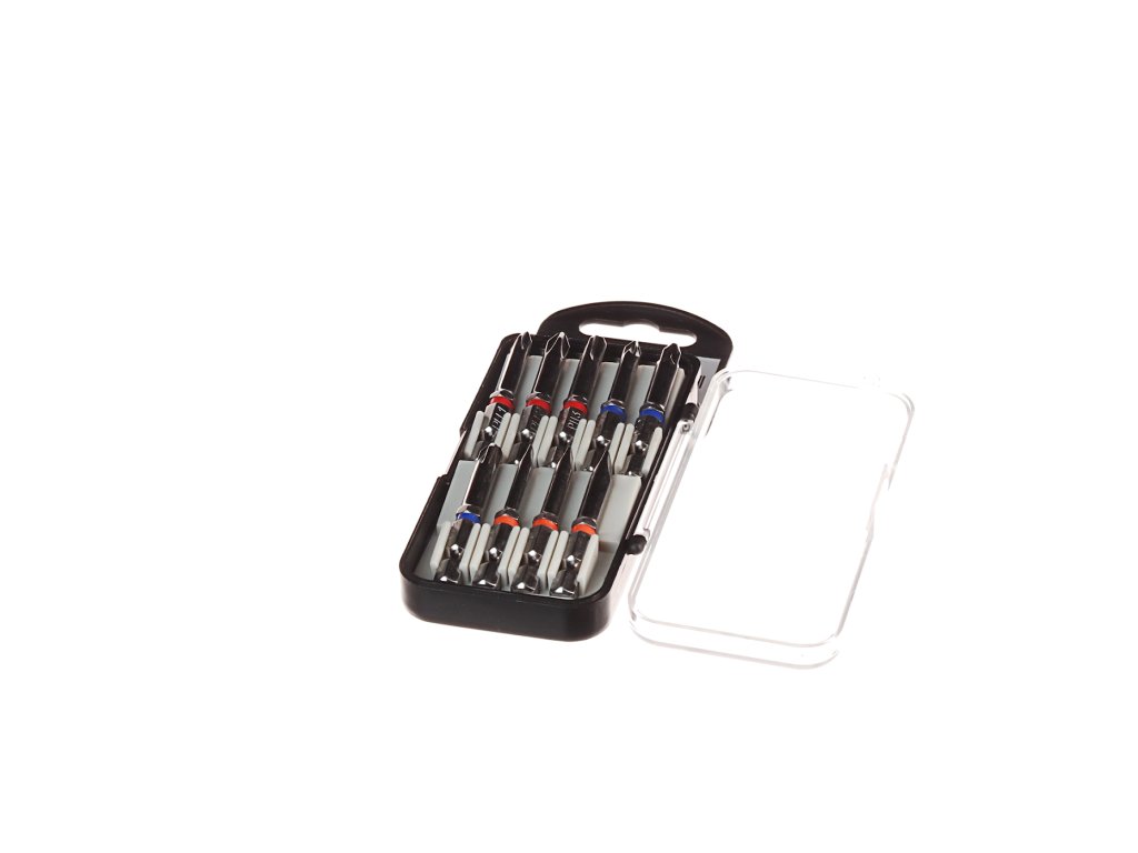 Im Set enthalten sind Kreuzschlitzbits PH1, PH2, PH3, PZ1, PZ2, PZ3 und Flachschrauberbits in der Breite 4, 5, 6, mm. Aufsatzlänge 50 mm. In einer Kunststoffbox mit transparentem Deckel aufbewahrt. Kann am Gürtel befestigt werden (nachdem die Aufhängung gedreht wurde).