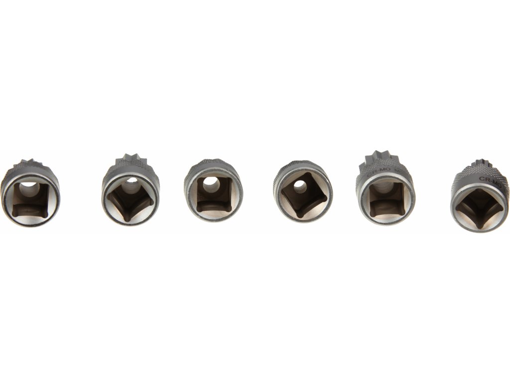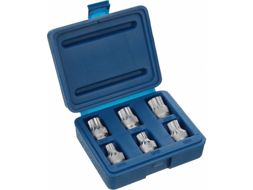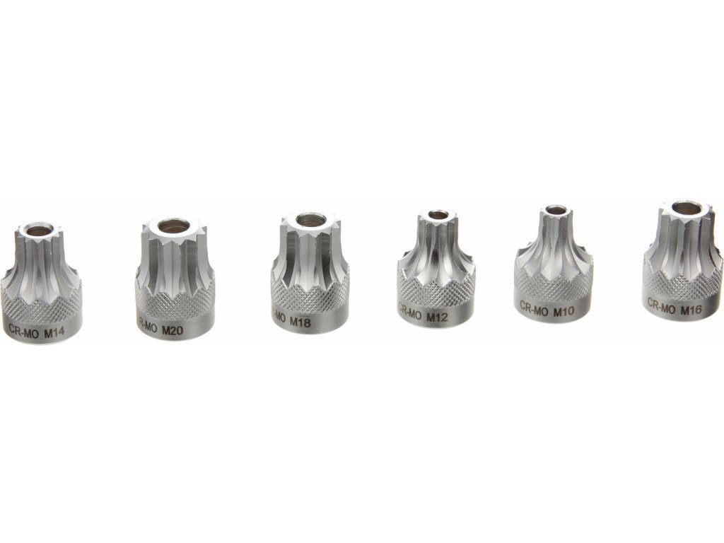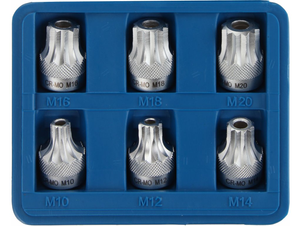 1/2"-Bits SPLINE, Länge 30 mm, Größen M10, M12, M14, M16, M18 und M20. Material CrV-Stahl, im Kunststoffkoffer aufbewahrt.
