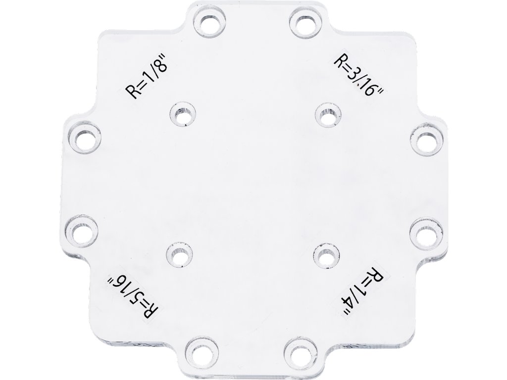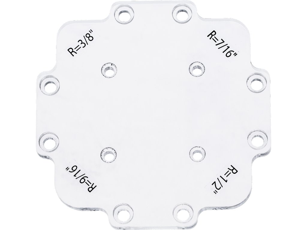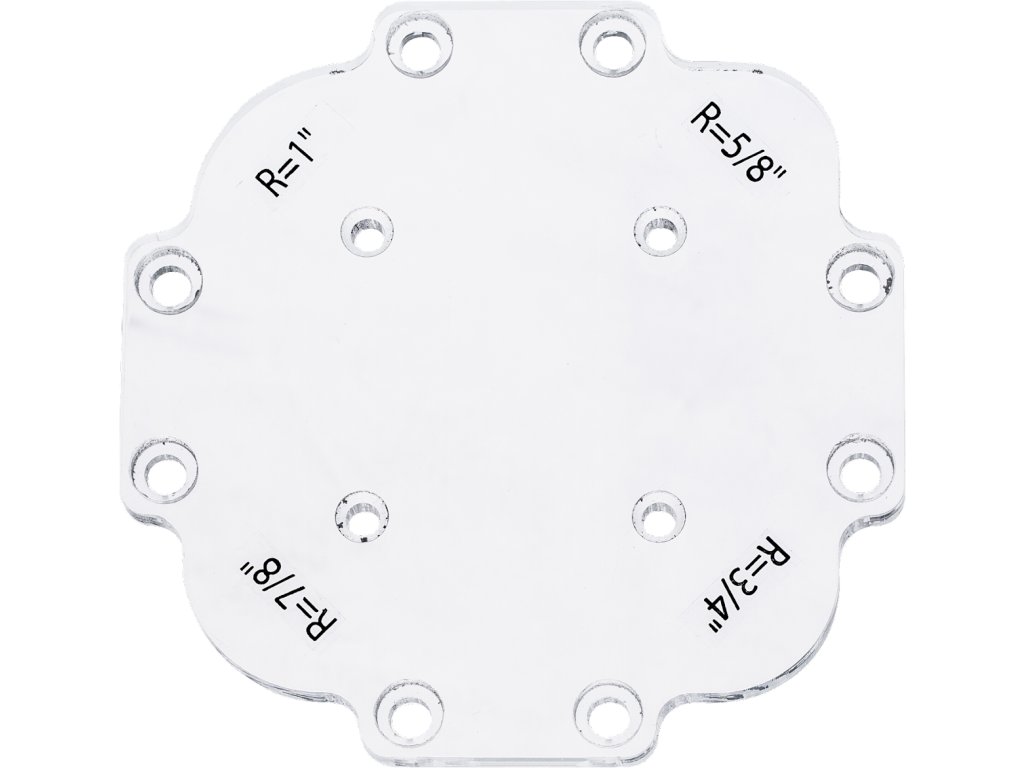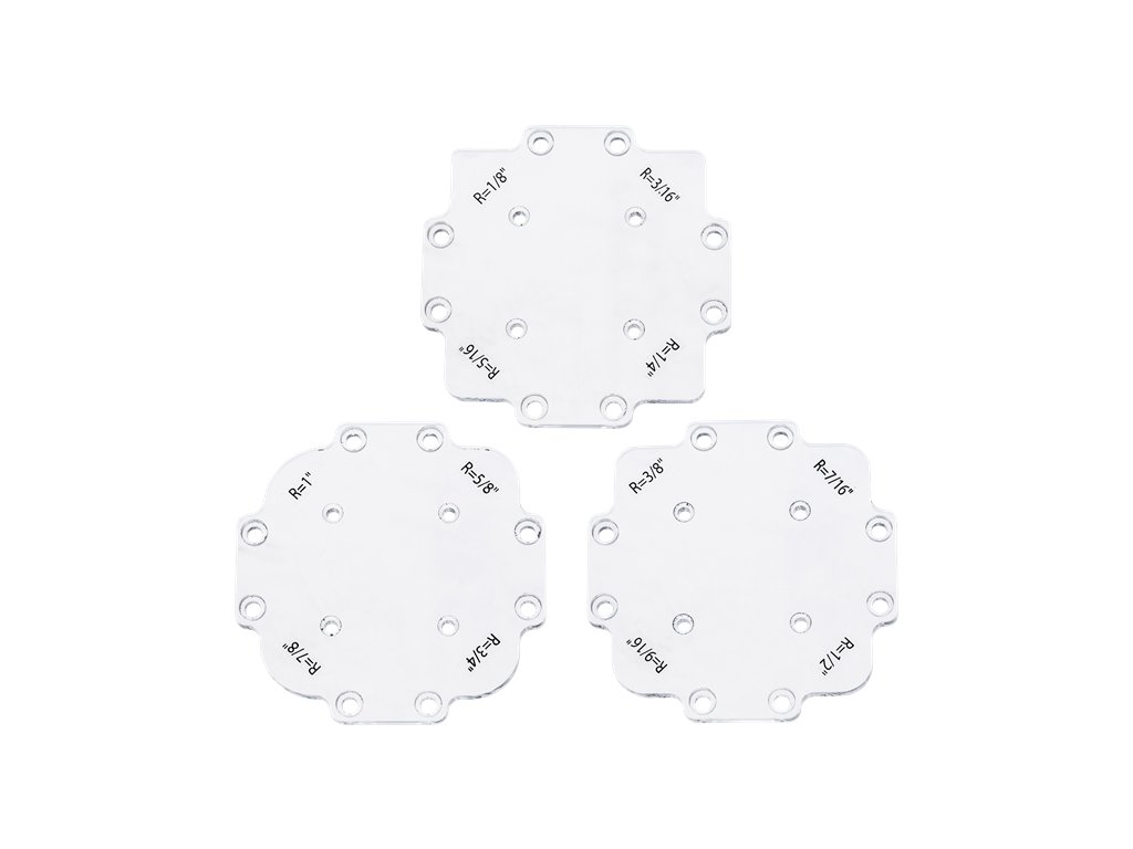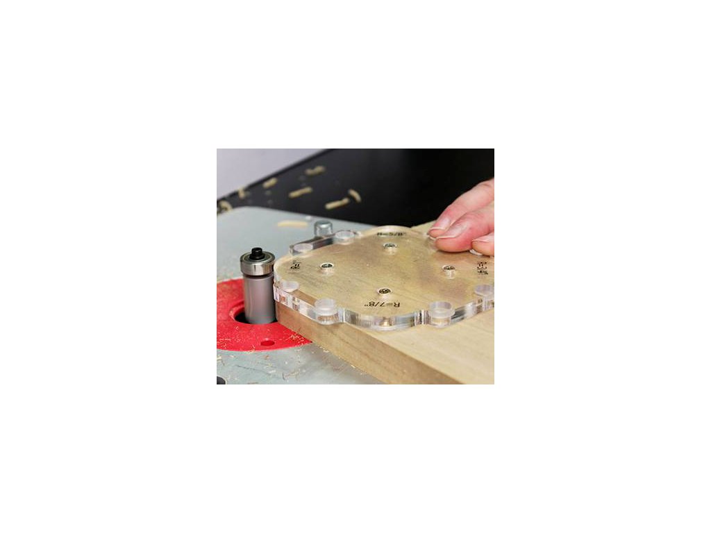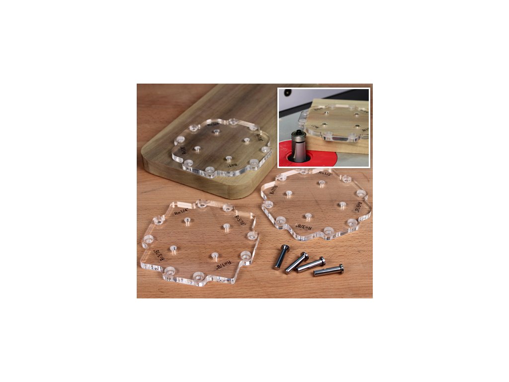 3 transparente Schablonen zum schnellen und präzisen Abrunden von Ecken mittels Oberfräsmaschine. Bogendurchmesser im Bereich 1/8" bis 1", Schritt je 1/8". Mit 4 Führungs-Druckzapfen, die in das vorgesehene Schablonen-Lochbild eingesetzt werden.