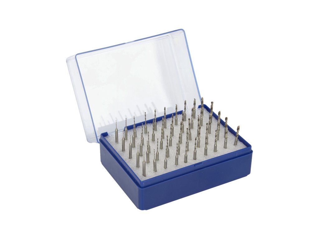 Bohrersatz, 50 Stück, aus HSS-Stahl mit Durchmessern 0,5; 0,6; 0,8; 1; 1,2; 1,3; 1,5; 1,6; 2; 2,2; je 5 St. von jedem Durchmesser, Schaftdurchmesser 2,3 mm.