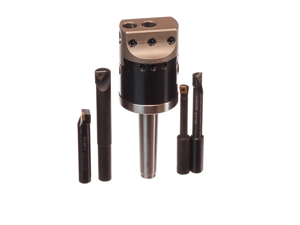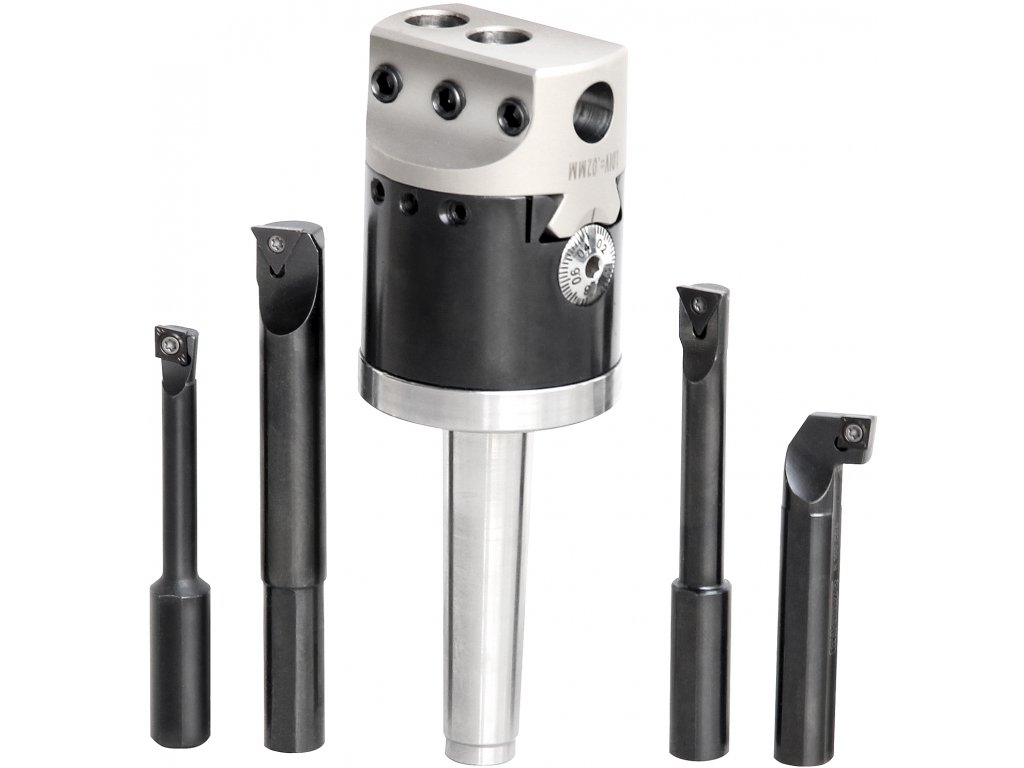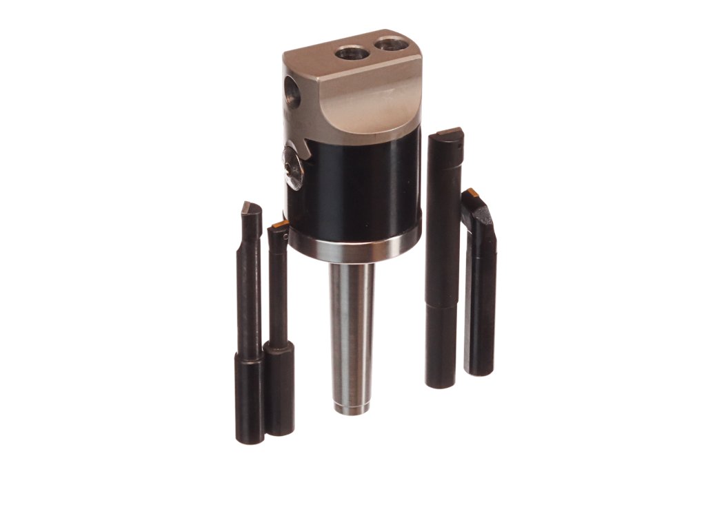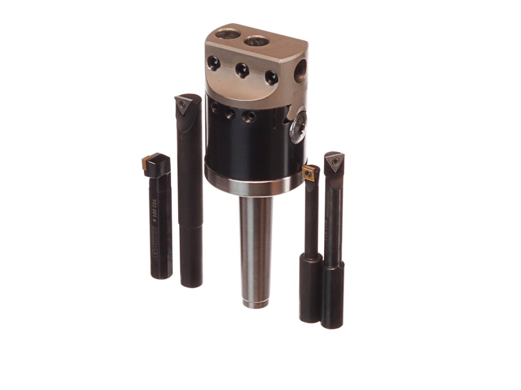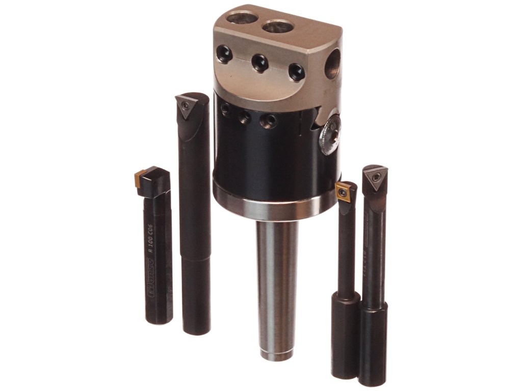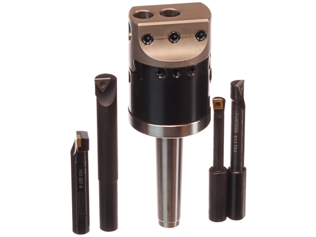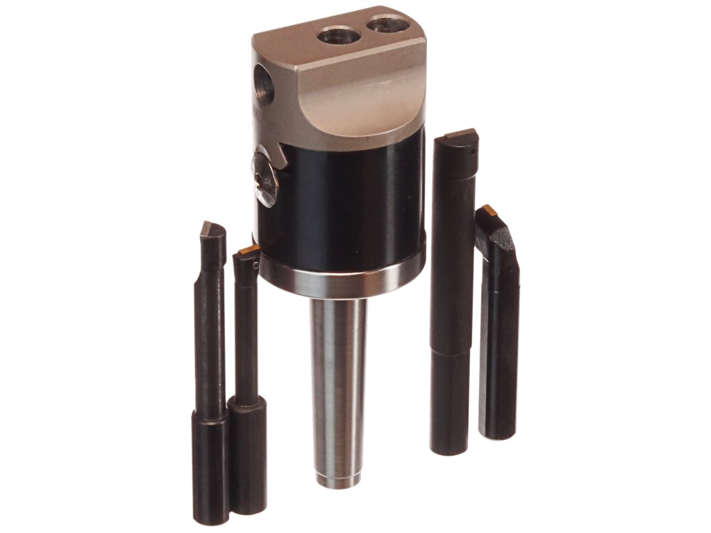 Der Kopf dient zum genauen Bohren von großen Löchern in Werkstücken, deren Form und Position der Löcher keine Drehbearbeitung ermöglicht. Der Kopf mit einem Außendurchmesser von 50 mm mit dem MK2-Klemmkonus ist mit beweglichen Schlitten und einer mikrometrischen Verschiebeschraube ausgestattet. Kopfgröße ø50x72 mm, Gesamtlänge 150 mm, Gewinde M10x1,5 mm im MK2-Konus, Messer (Durchmesser 12 mm) können parallel oder senkrecht zur Achse eingespannt werden. Im Set enthalten sind: Kopf, 3 Axialmesser und 1 Radialmesser. In einem Kunststoffkoffer verpackt.