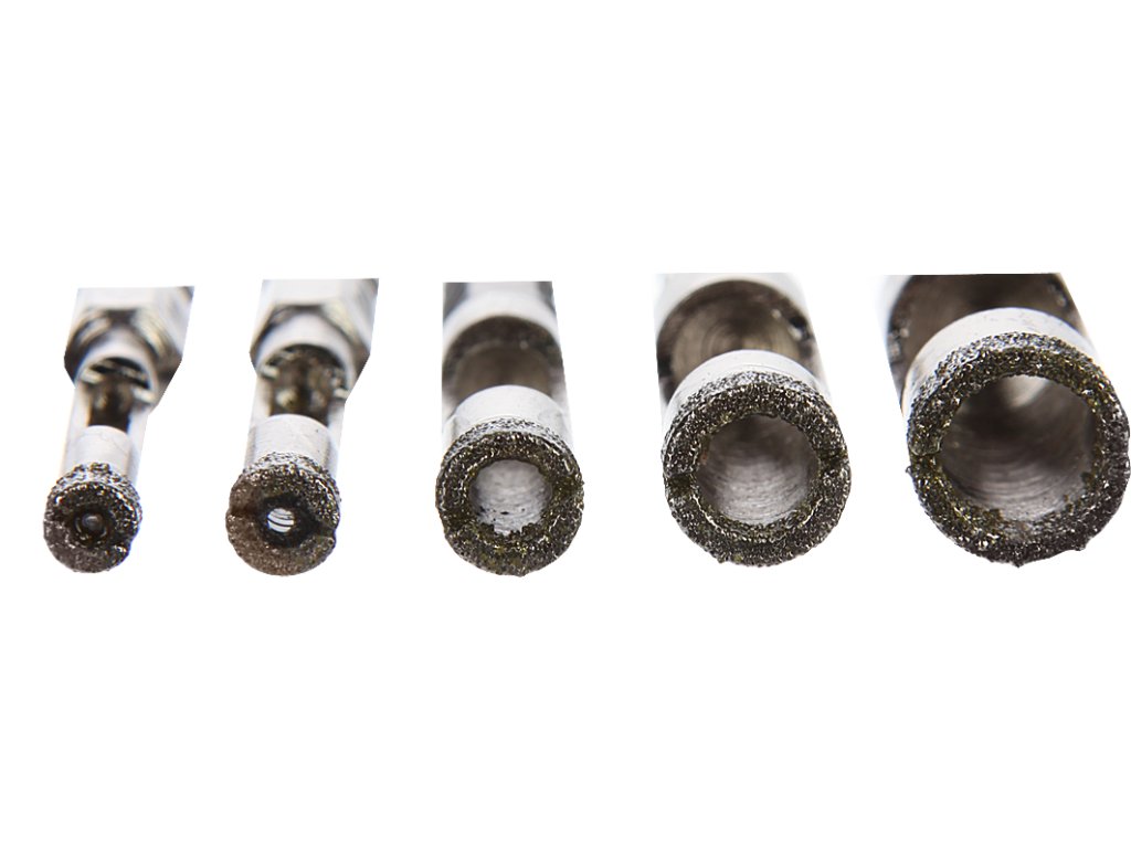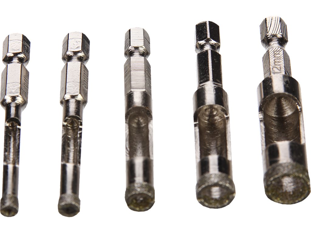 Kronenbohrer mit Diamant-Kopfbeschichtung, für Fliesen, Glas, Marmor und Granit geeignet, für Bohrmaschinen bestimmt, 1/4"-Sechskantschaft für schnellen Werkzeugwechsel, Ableitungsöffnung im Kern. Bohrerdurchmesser 5; 6; 8; 10; 12 mm. Empfohlene Drehzahl 800 U/min. Bohrer-Gesamtlänge 60 mm, Arbeitslänge 35 mm. Stärke des gebohrten Materials max. 30 mm. Bohren ohne Schlagvorgang. Alles in einer Alu-Box verpackt.