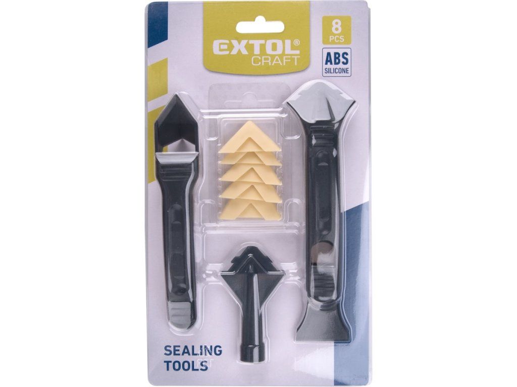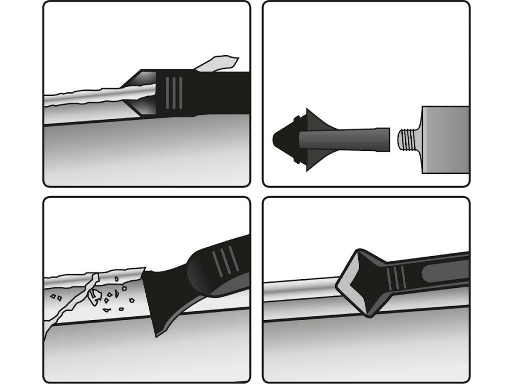 - Das Set enthält fünf Silikonaufsätze zum Glätten der Dichtmasse mit Radien in mm R3 - R6 - R10 - R13 - R17 (diese können mit einem Schaber am Kartuschenaufsatz oder am anderen Ende des Griffs befestigt werden); Das Set enthält außerdem einen Kartuschenaufsatz, einen Griff auf Silikonaufsätze mit Schaber und einen Griff mit einem Eckendichtstoffschneider mit Reinigungsdorn