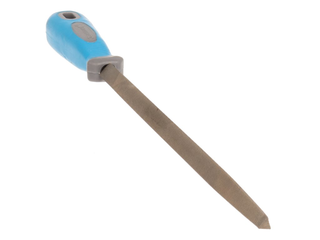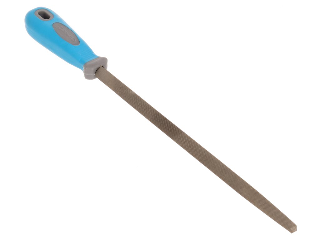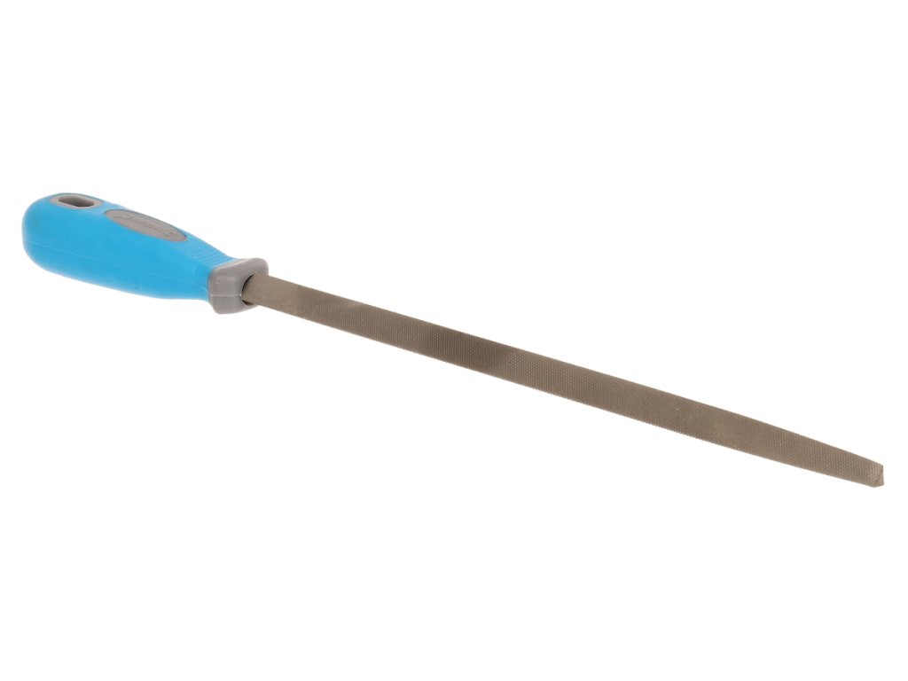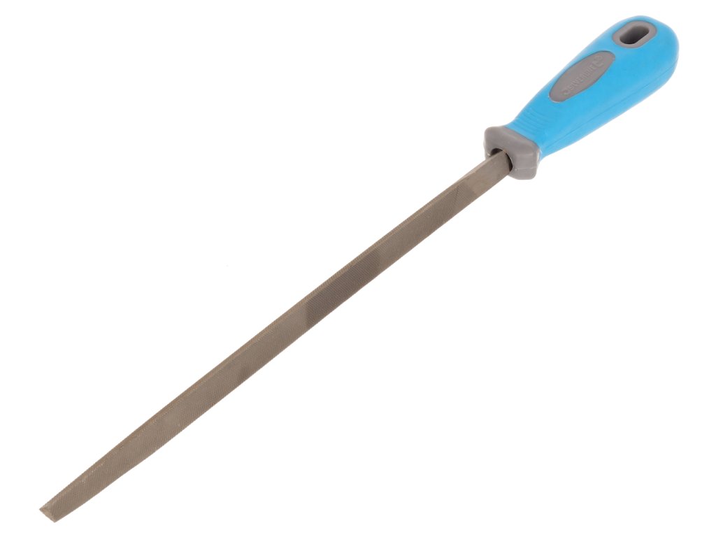 Werkstatt-Dreiecksfeile 250 mm. Doppelschnitt von ca. 36 Zähnen pro Zoll. Weicher Griff mit Loch zum Aufhängen.