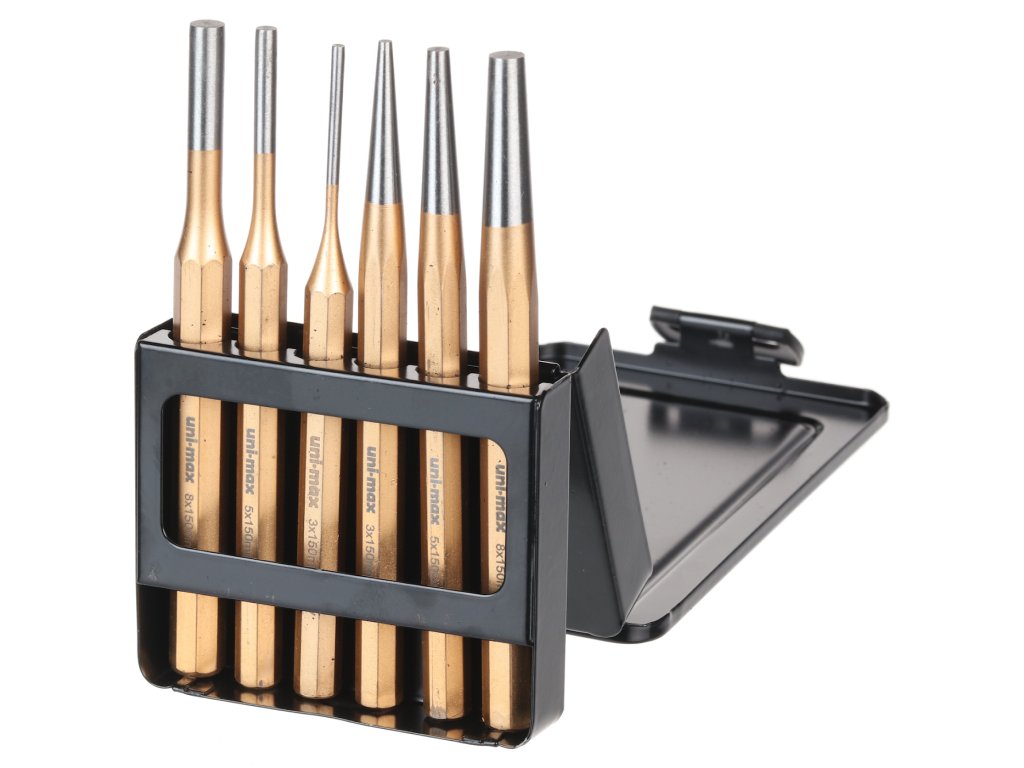 3 Durchtreiber und 3 Splintaustreiber im Set. Durchtreiber mit den folgenden Abmessungen: Ø 3; 5 und 8 × 150 mm, Austreiber Ø 3; 5 und 8 × 150 mm. Für eine lange Lebensdauer bestehen die Werkzeuge aus CrV-Stahl. In einer Kunststoffbox verstaut.