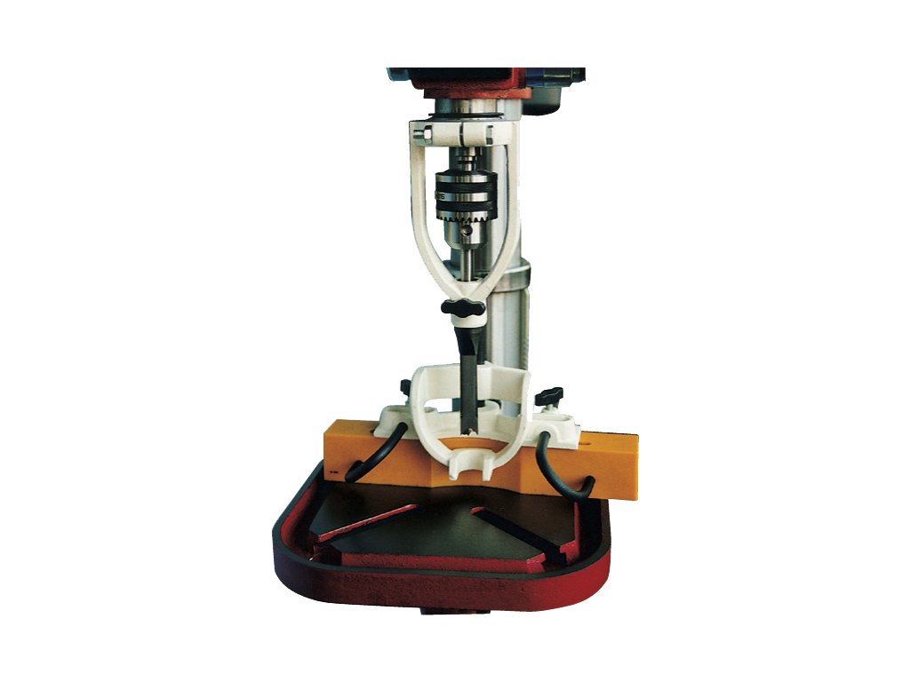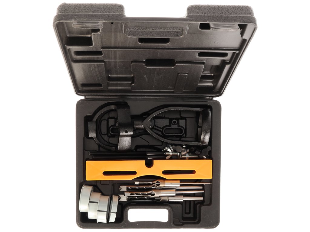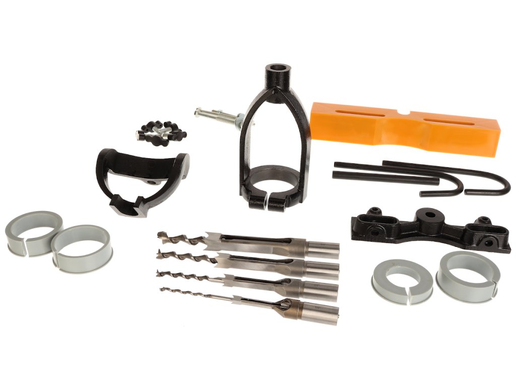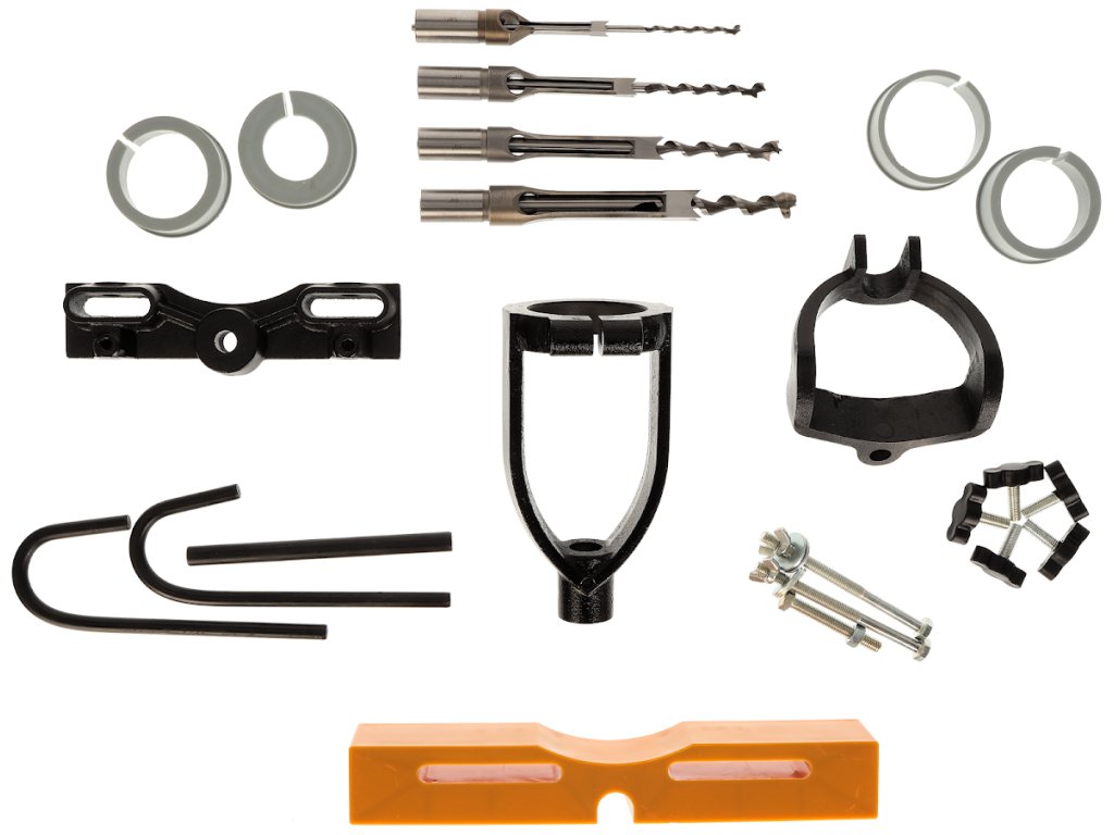Vierkantbohrern an einer Tischbohrmaschine mit einem Spanndurchmesser von 65 mm ausgelegt. Das Paket enthält komplettes Zubehör für den Einsatz des Anbaugeräts einschließlich Spannelemente, verstellbare Anschläge und Spannreduzierungen 65/60, 65/55; 65/52,5 und 65/40 mm. Alles verpackt in einem praktischen Koffer zusammen mit einem Satz Einsteckbohrer in den Größen 1/4", 3/8", 1/2" und 5/8", Schaftdurchmesser 20 mm.