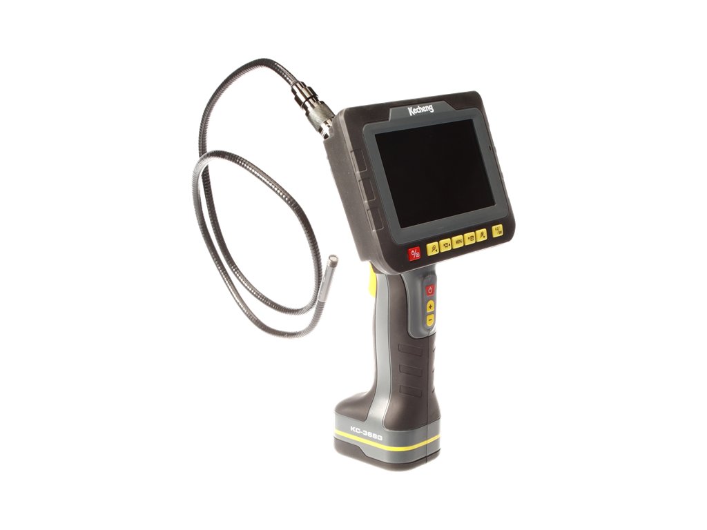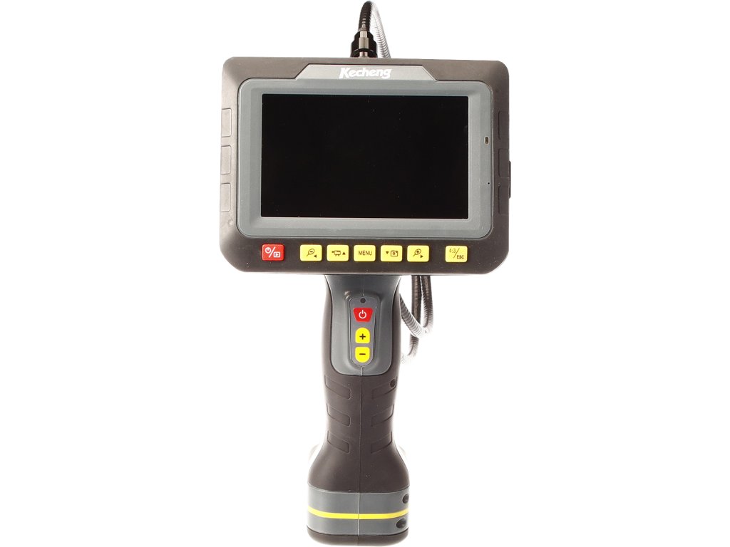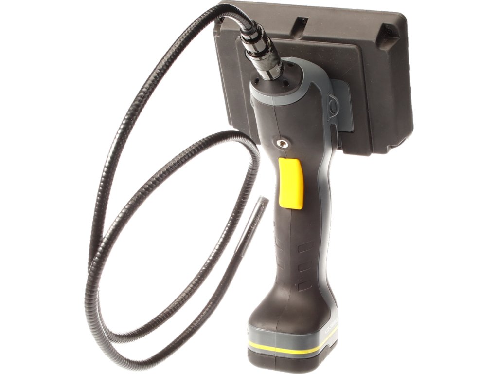 Abtrennbares Display mit drahtloser Signalverbindung (2,4 MHz) mit einer Reichweite von bis zu 10 m. Arbeit auch in feuchter Umgebung möglich. LED-Beleuchtung im Sondenkopf. Beobachtungswinkel der Kamera 60°, Brennweite 50 mm, Zoom ×4, flexible Sonde, Länge 1 m, Durchmesser des Kamerakopfs ø 9 mm, 5" TFT/LCD-Display, Auflösung 800 × 480 Pixel, Schutzart der Sonde IP67, interner Speicher 128 MB, Erweiterung durch MicroSD bis auf 16 GB, Datenübertragung an TV/PC OS WinXP/Vista/W7/W8 über USB 2,0. Versorgung durch eine Lithium-Batterie 7,4 V/1,5 Ah, Betriebszeit ca. 2,5 Std., Ladedauer ca. 3,5 Std., Betriebstemperatur: 0 – 45 °C. Im Lieferumfang ist Folgendes enthalten: Magnet, Haken zum Herausholen kleinerer Gegenstände, 45°-Spiegel, Schutzgehäuse, 230-V-/50-Hz-Ladegerät, Kabel wie auch eine CD mit der Installationssoftware.