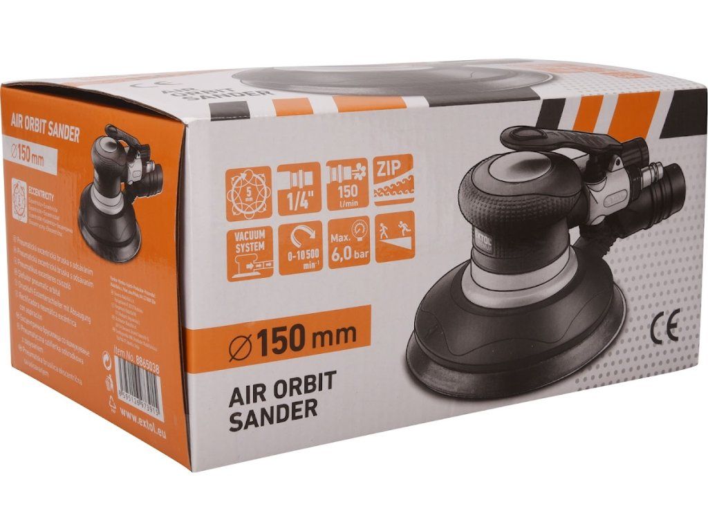 Der pneumatische Exzenterschleifer ist für das Schleifen von Holz, Metallen, Kunststoffen, Fugenmörtel und Emaille sowie zum Polieren konzipiert. Die Schleifmaschine verfügt über einen Ausgang für den Anschluss einer externen Staubabsaugung und eines Drehzahlreglers. Der Schleifradträger ist mit einem Velcro Verschluss ausgestattet, der einen schnellen, werkzeuglosen Schleifpapierwechsel ermöglicht.