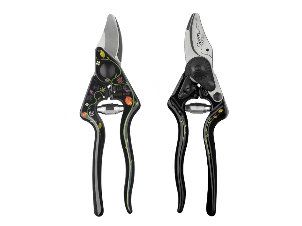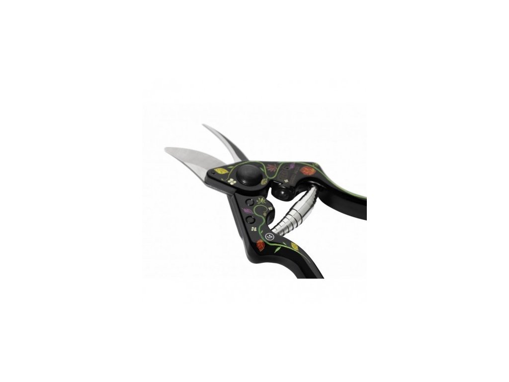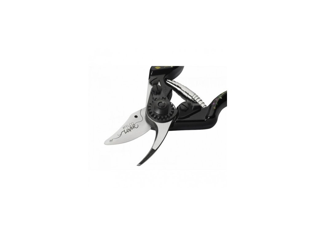 FELCO 6 Schere diesmal inSonderausgabeStéphane Marie. Die Griffe aus metallisiertem Aluminium werden während der Produktion zunächst schwarz eloxiert, dann wird das Motiv aus Stéphane Maries Herbarium mittels UV-Druck auf den schwarzen Griff aufgebracht, und die abschließende Schutzschicht der Griffe ist eine Pulverbeschichtung.