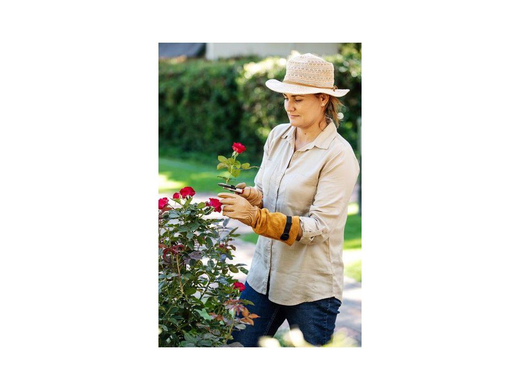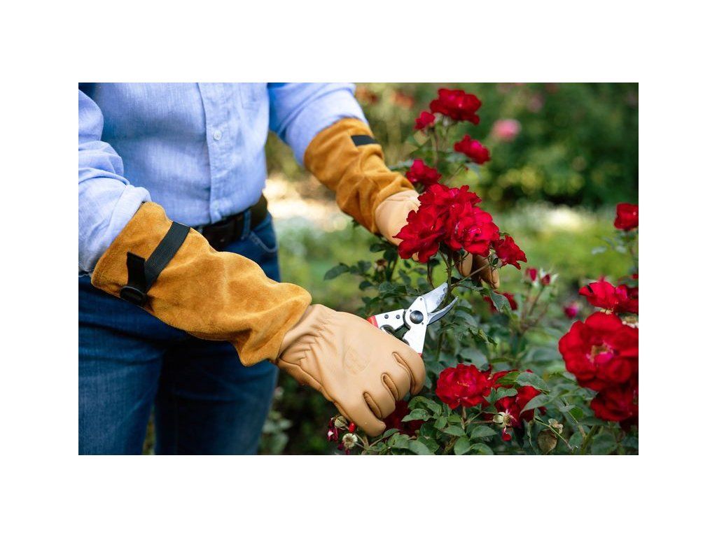 Die aus echtem Rindsledervelours gefertigte Stulpe des Handschuhs bietet Schutz für den Unterarm vor Dornen.