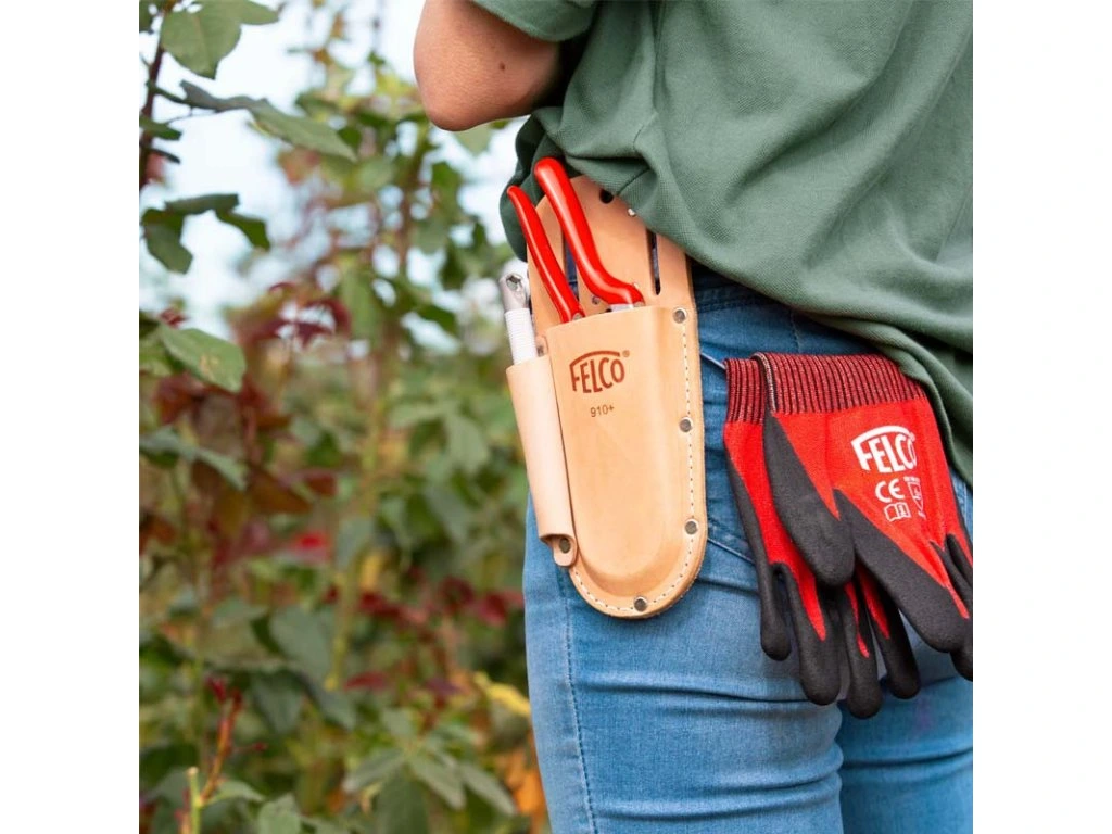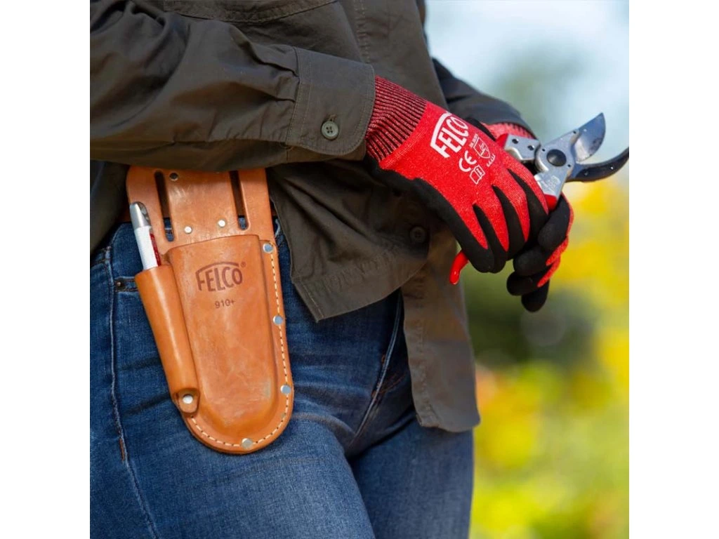 Das Etui für die FELCO 910+ ist ein praktisches Zubehör für alle, die ihre FELCO Gartenschere und den FELCO 903 Schärfapparat stets griffbereit haben möchten. Gefertigt aus echtem Leder, bietet es eine elegante und zugleich äußerst robuste Lösung zur sicheren Aufbewahrung des Werkzeugs. Dank der Befestigungsmöglichkeit am Gürtel mit Schlaufe oder Metallclip ist es ideal für Arbeiten im Freien, wo schneller Zugriff und optimaler Schutz des Werkzeugs wichtig sind. Das Etui passt sich mit der Zeit der Form der Schere an und bietet so dauerhaften Schutz und Komfort.