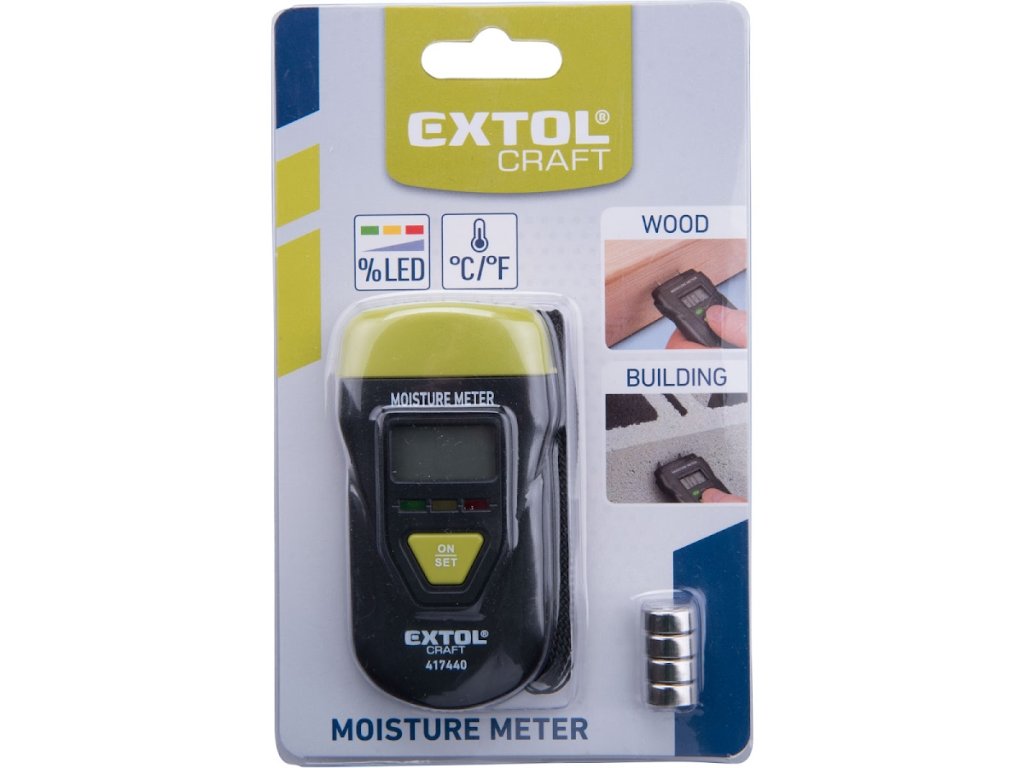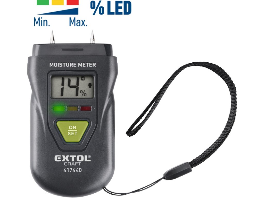 Das Feuchtemessgerät eignet sich zur Feuchtemessung in Schnittholz (auch in Papier, Pappe) und gehärteten Materialien (Mörtel, Beton und Putz). Es zeigt auch die Luftfeuchtigkeit oder die Lufttemperatur an. Er verfügt über drei LEDs, die den Feuchtigkeitsgehalt des zu messenden Materials anzeigen.