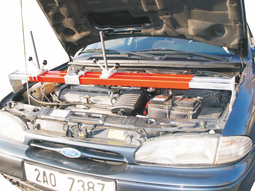 Vorrichtung zur Fassung von längs sowie quer gelagerten Motoren bei PKWs. Bei Getriebedemontage sowie anderen Handhabungen mit Aggregaten geeignet. Stützenbreite im Bereich 100 – 1 700 mm verstellbar. Hub mit Schrauben M16 im Bereich von 250 mm. Integrierte Zentralaufhängung gibt die Möglichkeit, im Bedarfsfall die Vorrichtung auch mit aufgehängtem Aggregat mit dem Werkstattkran zu heben. Tragfähigkeit 250 – 400 kg (bei Anwendung von beiden Aufhängungsketten).