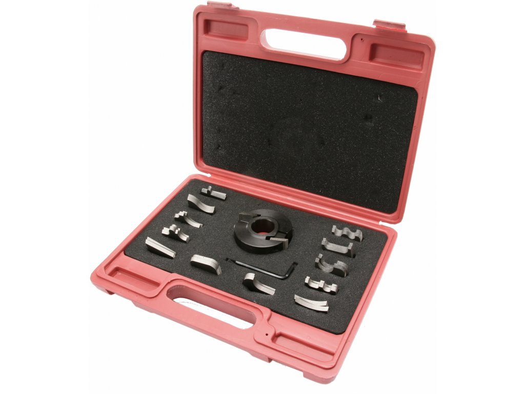 Ein Set mit Fräskopf und 13 Paar austauschbaren Profilmessern. Der Kopf mit Körper-ø 77 mm und Spann-ø 30 mm ist für Messer mit zwei Positionsöffnungen 1/4″, Breite 1-1/16″, Höhe 1-3/8″ und Dicke 5/32″ vorgesehen. Der Schnittdurchmesser hängt von den verwendeten Messern ab. Empfohlene Drehzahl 5.800/8.300 U/min In einem Kunststoffkoffer übersichtlich verstaut.