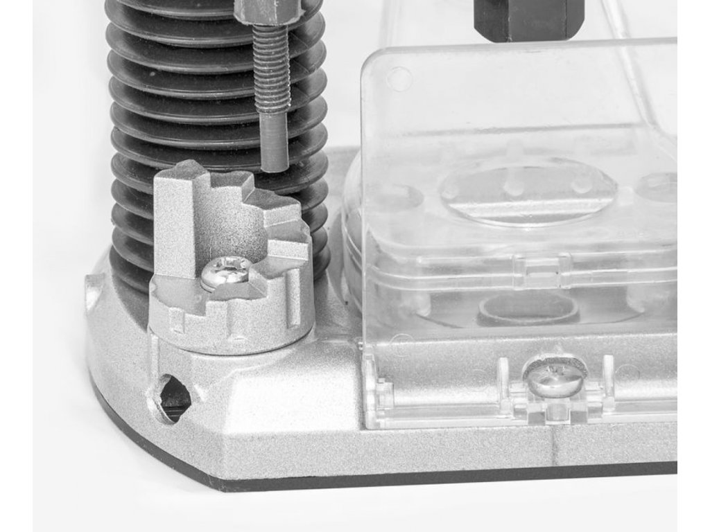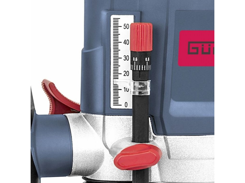 8-stufige Drehzahlvorwahl entsprechend der Art des zu bearbeitenden Materials (→ Bereich: 11.000 - 30.000 U/min), präzise Einstellung der Schnitttiefe 0 - 55 mm, Wellenarretierung für einfachen/schnellen Messerwechsel.