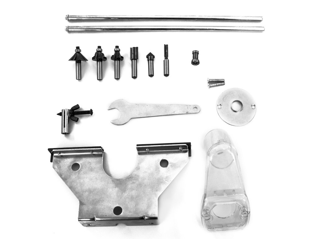 Zubehör: Fräser (6), Spannzangen (→ Durchmesser: 6/8 mm), Längsanschlag mit Führungsstangen, Zentrierstift des Fräskreises, Kopierring, Seitenschlüssel.