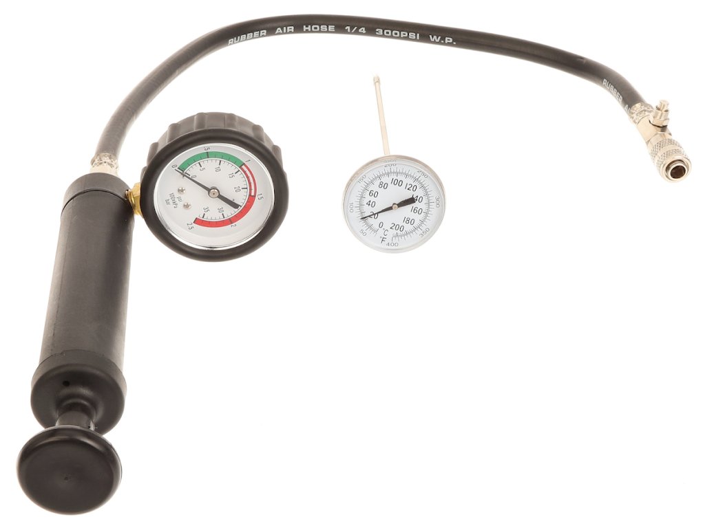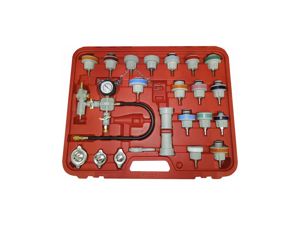 Der Satz ist zum Dichtheittesten und zur Kühlsystem-Fehlersuche bei den meisten PKW-Marken geeignet. Die farbig gekennzeichneten Deckel erleichtern die Orientierung bei der Auswahl, Prüf-Druckpumpe mit Bereich 0 – 2,5 bar, Manometer, Kühlerdeckel und Schlauch. Alle Teile übersichtlich in einem Kunststoffkoffer aufbewahrt.