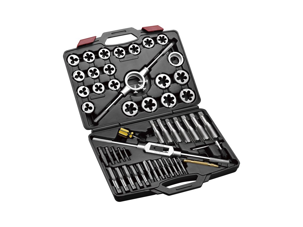 Im Lieferumfang enthalten: Drehkreuze für Gewindebohrer und Gewindeschneider, Schraubendreher, T-Schlüssel, Zwischenring, Abzieher (1; 2; 3; 4 und 5), 20 St. Gewindebohrer (M6 × 0,75; M6 × 1; M8 × 1; M8 × 1,25; M10 ×1,25; M10 × 1,5; M12 × 1,5; M12 × 1,75; M14 × 1,5; M14 × 2; M16 × 1,5; M16 × 2; M18 × 1,5; M18 × 2,5; M20 × 1,5; M20 × 2,5; M22 × 1,5; M22 × 2,5; M24 × 1,5 und M24 × 3); ferner 14 Gewindeschneider Durchmesser 38 mm (M6 × 0,75; M6 × 1; M8 × 1; M8 × 1,25; M10 ×1,25; M10 × 1,5; M12 × 1,5; M12 × 1,75; M14 × 1,5; M14 × 2; M16 × 1,5; M16 × 2; M18 × 1,5; M18 × 2,5) und 6 St. Gewindeschneider Durchmesser 50 mm (M20 × 1,5; M20 × 2,5; M22 × 1,5; M22 × 2,5; M24 × 1,5 und M24 × 3). Die Werkzeuge werden in einem Kunststoffkoffer geliefert.