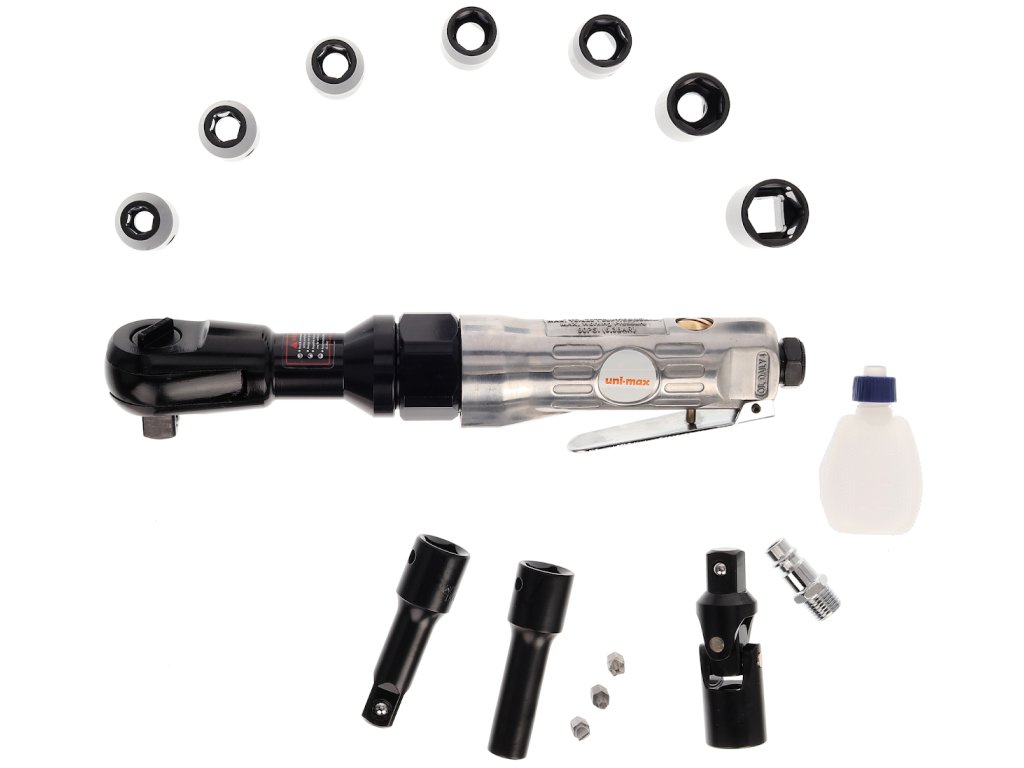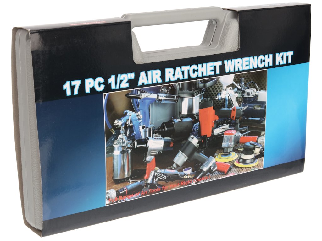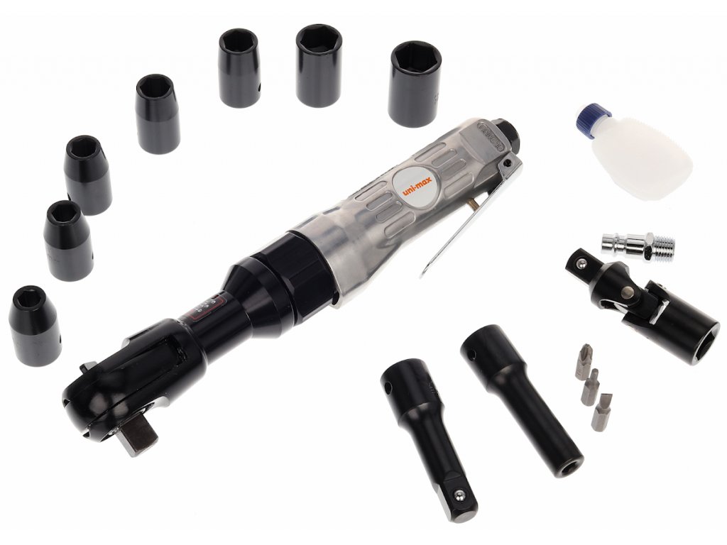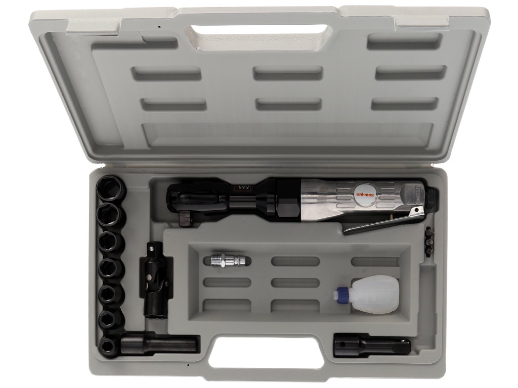 1/2"-Druckluftknarre mit L- und R-Lauf, für einfache Schraubverbindungsmontage und -demontage. Geeignet für enge Platzverhältnisse, wo keine Bewegung mit einer klassischen mechanischen Knarre möglich ist. Arbeitsdruck 90 PSI, max. Drehmoment 69 Nm, Leerlaufdrehzahl 160/min., Werkstoff Stahl/Aluminium. Zubehör: geschwärzte Nüsse 9, 10, 11, 13, 14, 17 und 19 mm, Verlängerungsaufsatz 75 mm, Adapter für Schraubbits, Schnellkupplungseinschub G1/4"AG, 3 Bits und Öler. Alles in einer Kunststoffkassette aufbewahrt.