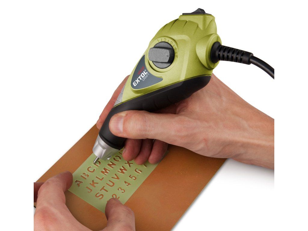 Elektrischer Mikropunk-Gravierstift zum einfachen, schnellen und dauerhaften Schreiben, Markieren und Verzieren von Gegenständen aus Glas, Kunststoff, Holz, weichen Metallen, Stahl usw. Spannungsversorgung 230 V/50 Hz, Stromverbrauch 13 W, Schlaggeschwindigkeit 6000/min, Gravierspitze aus Wolframkarbid, für Materialhärte bis 58 HRC (Holz, Glas, Kunststoff, weiche Metalle, Stahl usw.), el. Tiefenregelung. Stiftdesign, dünnes Griffteil und Ausgewogenheit für natürlichen und angenehmen Griff und einfache, schnelle, ermüdungslose und präzise Arbeit. Gummiertes Griffteil, elektronische Graviertieferegelung, die Hartmetallspitze kann einfach abgenommen und ggf. nachgeschliffen werden, Lieferung inklusive Schablone zum Gravieren von Buchstaben und Zahlen.