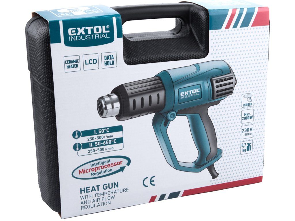 Die Heißluftpistole ist zum Erwärmen von Oberflächen zwecks der Entfernung von Anstrichen (Farben, Lacke), zum Trocknen frisch aufgetragener Anstriche, zum Formen und Verbinden von Kunststoffen (z. B. Rohren) und Asphaltdachdeckungen, zum Lösen von Klebeverbindungen, Löten, zum Abtauen von gefrorenem Wasser, zum schonenden Trocknen etc. bestimmt. Die Pistole ist mit einem großen und übersichtlichen LCD-Display ausgestattet, in dem die Soll- und Ist-Temperatur wie auch die Luftströmungsintensität angezeigt wird. Im Lieferumfang enthalten ist Edelstahl-Zubehör und ein Transportkoffer.