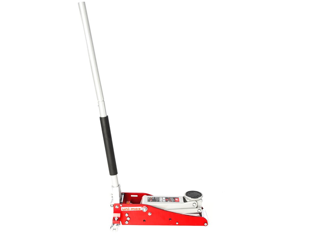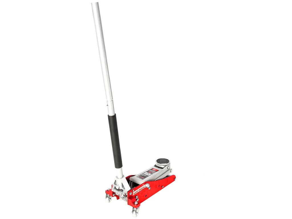 Hydraulischer Alu-Heber mit niedrigem Profil mit doppelter Schnellhubpumpe, 2 drehbare Stahlrollen, vorne breite Rollen für gute Stabilität. Maximale Höhe 90 mm, maximale Höhe 358 mm, Tragfähigkeit 1.500 kg.