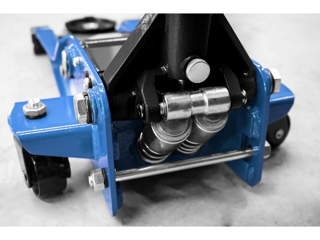 Mobiler hydraulischer Wagenheber, geeignet zum Anheben von Fahrzeugen mit abgesenktem Fahrgestell (→ max. Tragfähigkeit: 2,5 Tonnen).
