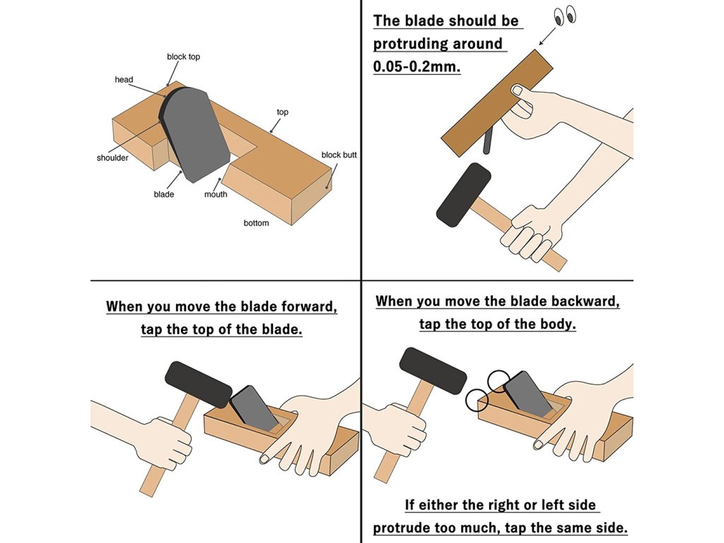 Klopfen Sie beim Anbringen der Klinge leicht mit einem Hammer auf die Oberseite des Bügeleisens. Die Klinge sollte ca. 0,05 bis 0,2 mm vorstehen. Klopfen Sie beim Entfernen der Klinge leicht mit einem Hammer auf die oberen Ecken des Hobelkörpers. Wenn die rechte oder linke Seite der Klinge zu weit herausragt, klopfen Sie leicht auf die gleiche Seite wie die hervorstehende Klinge.