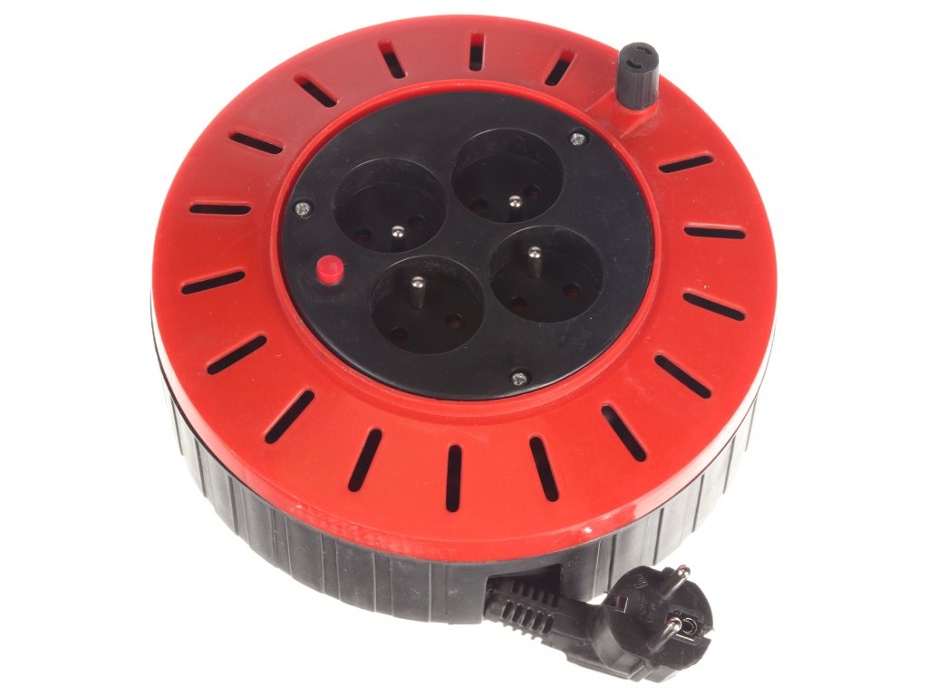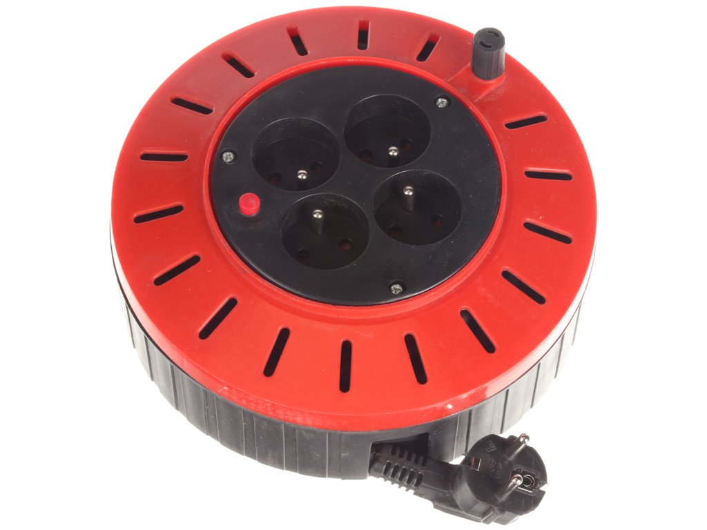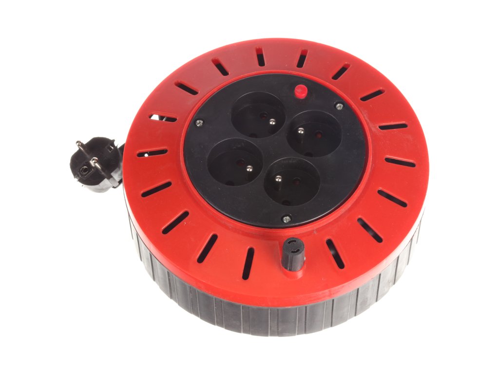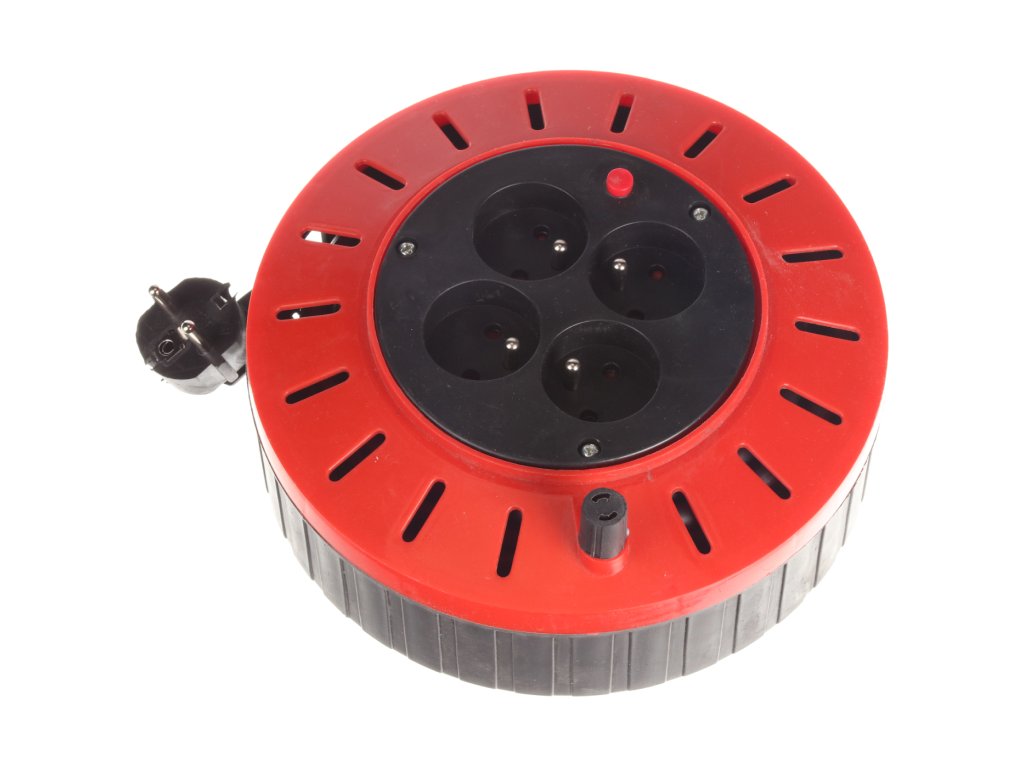 Mit 4 230V-Steckdosen, flexiblem Kupferkabel 3 × 1,5 mm2 mit PVC-Mantel (H05VV-F), einem Schutztaster und einem Wickelgriff ausgestattet. Rollenmaterial PP Drum, Durchmesser 210 mm, Breite 100 mm.