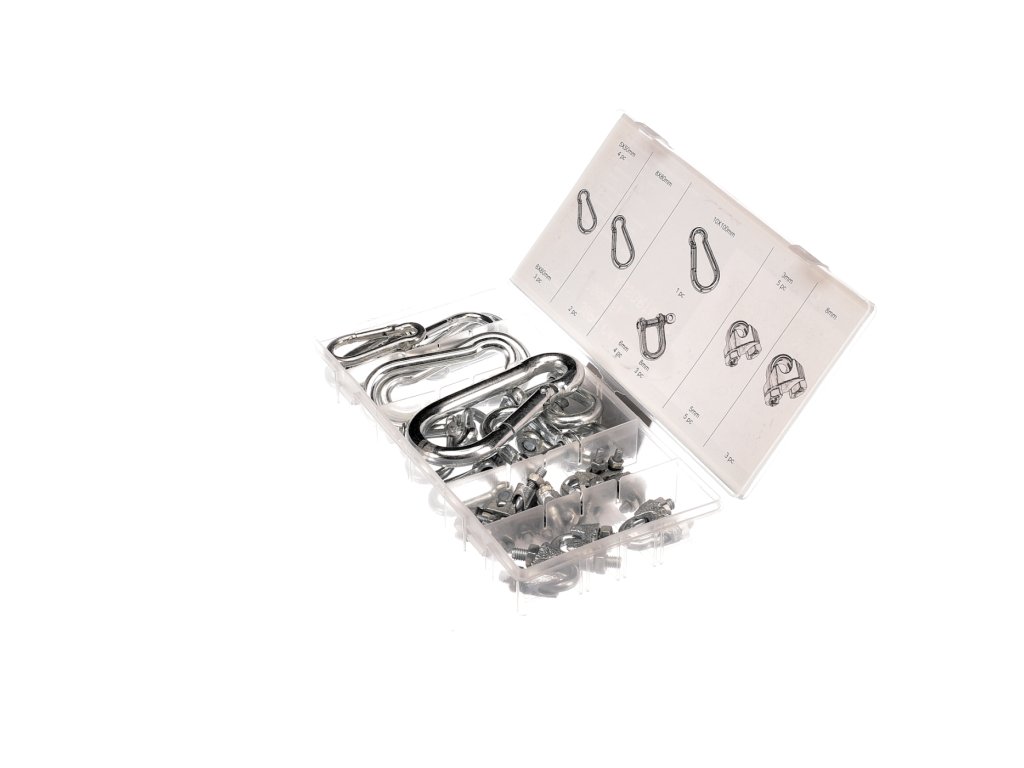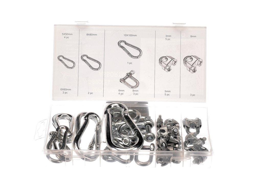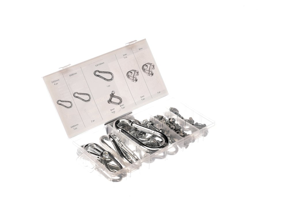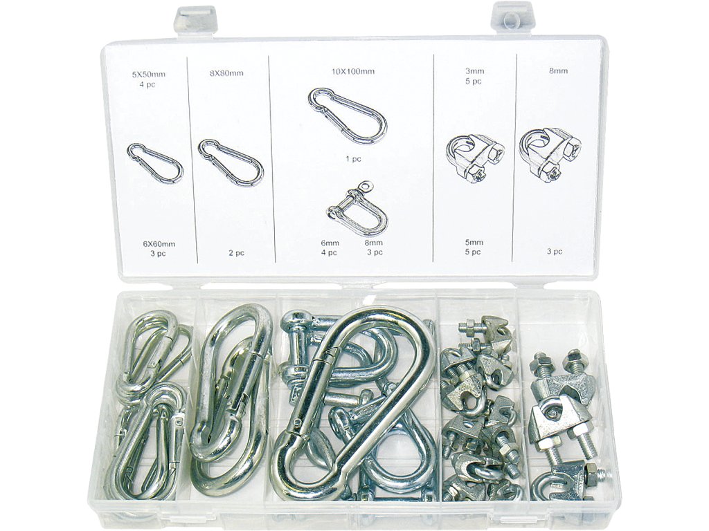 Inhalt: Karabiner – 5 × 50 mm / 4 St.; 6 × 60 mm / 3 St.; 10 × 100 mm / 1 St. D-Klemmen – 6 mm / 4 St.; 8 mm / 3 St. Seilklemmen – 3 mm / 5 St.; 5 mm / 5 St.; 8 mm – 3 St. Material: Karbonstahl, in Kunststoffbox aufbewahrt.