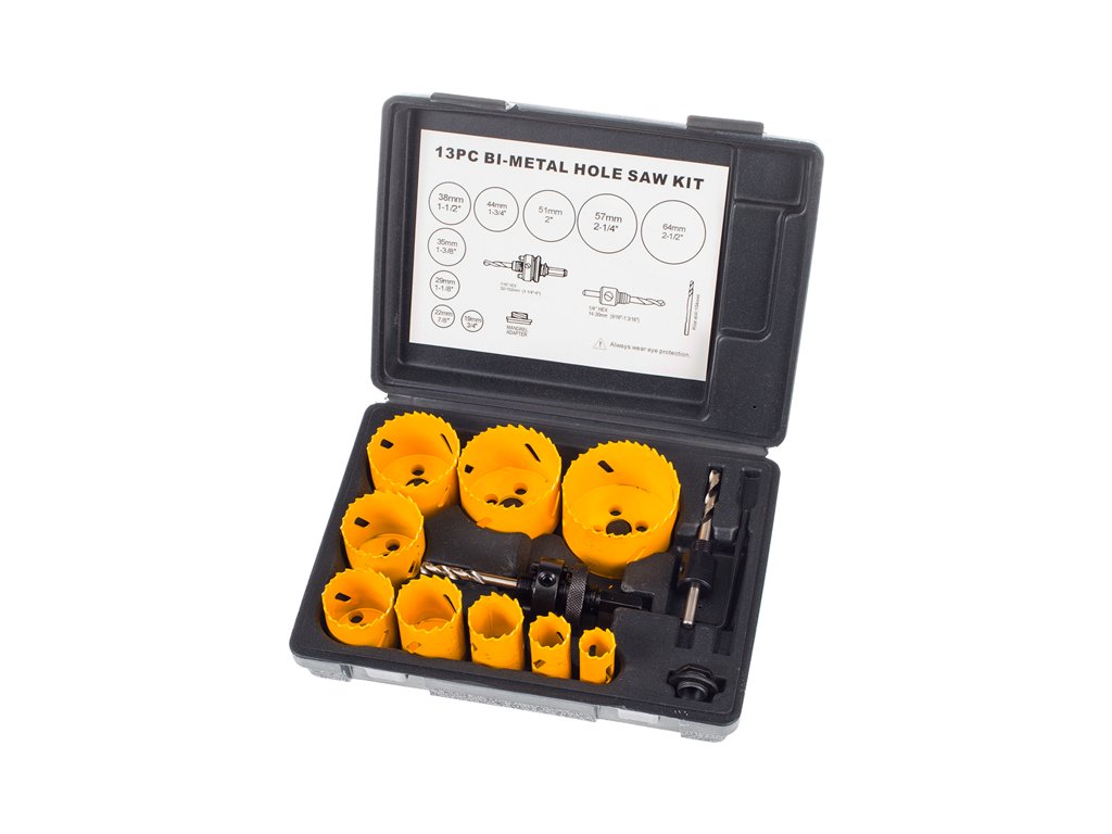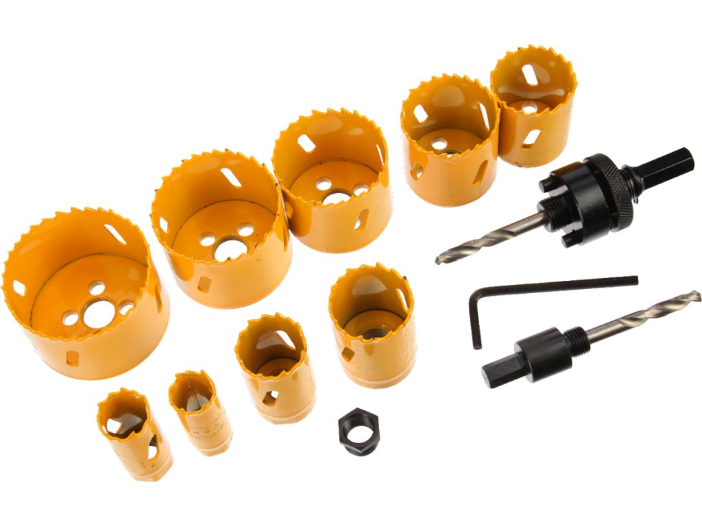 Kernbohrersatz HSS/bi-metal der Durchmesser: 19, 22, 29, 35, 38, 44, 51, 57, 64 mm. Satz enthält zwei Köpfe für Befestigung von Bohrer und Kern (19-35 und 38-64 mm). Geeignet für Bohren von Holz, Kunststoff und Metall. Klingenhärte 64-66 HRC.